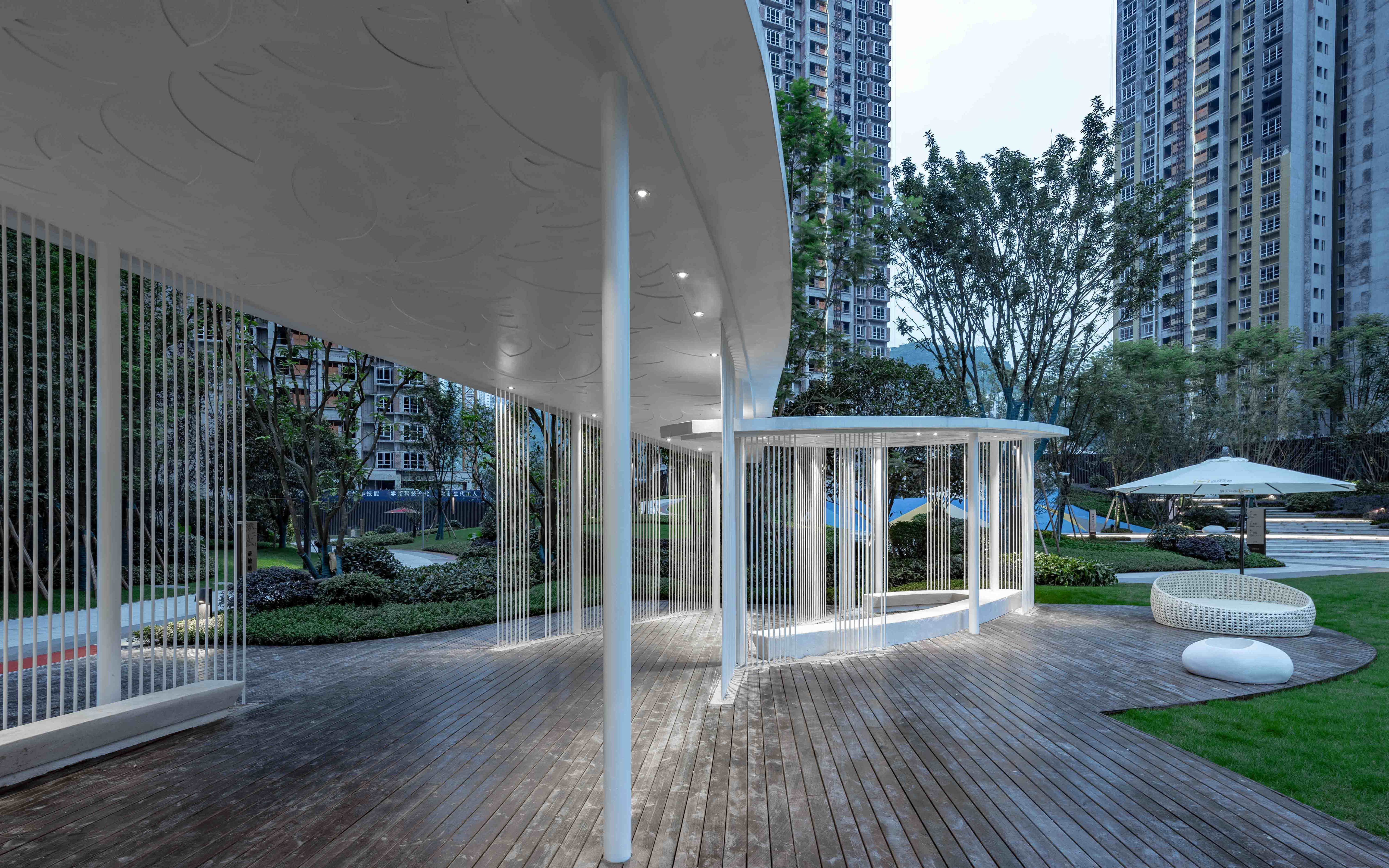 休閑廊架打破傳統(tǒng)對于住宅景觀的表達(dá),去蕪存菁,摒棄了冗繁細(xì)碎的裝飾語言。其形態(tài)同樣取自于舟島,整個廊架的構(gòu)造方式比較的輕盈,像兩片扁舟漂浮在中庭,白色現(xiàn)代的造型,也突出現(xiàn)代、純凈、時尚的都市感。