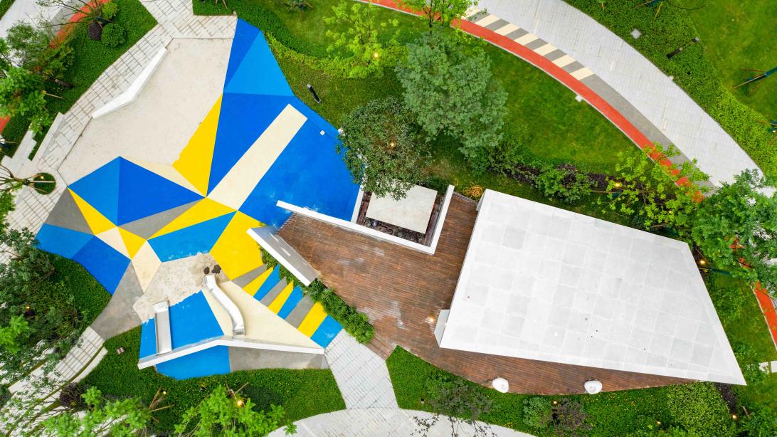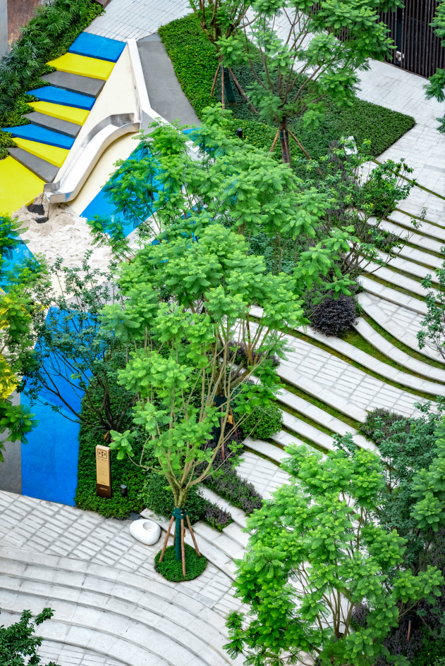 我們借勢地形的高差,在中庭做了一個687m2的兒童樂園。借助折紙的靈感,把樂園切割為不同斜面,為孩子們創(chuàng)造了一個安全有趣的坡地玩??臻g。形成了0-3歲游玩區(qū)(沙坑),3-6歲、6-12歲游玩區(qū)(互動),6-12歲游玩區(qū)(攀爬)及家長和幼兒休息區(qū),讓不同年齡階段的兒童都能找到屬于自己的活動空間,實現(xiàn)更人性化的幼兒活動場地以及幼兒看護(hù)。