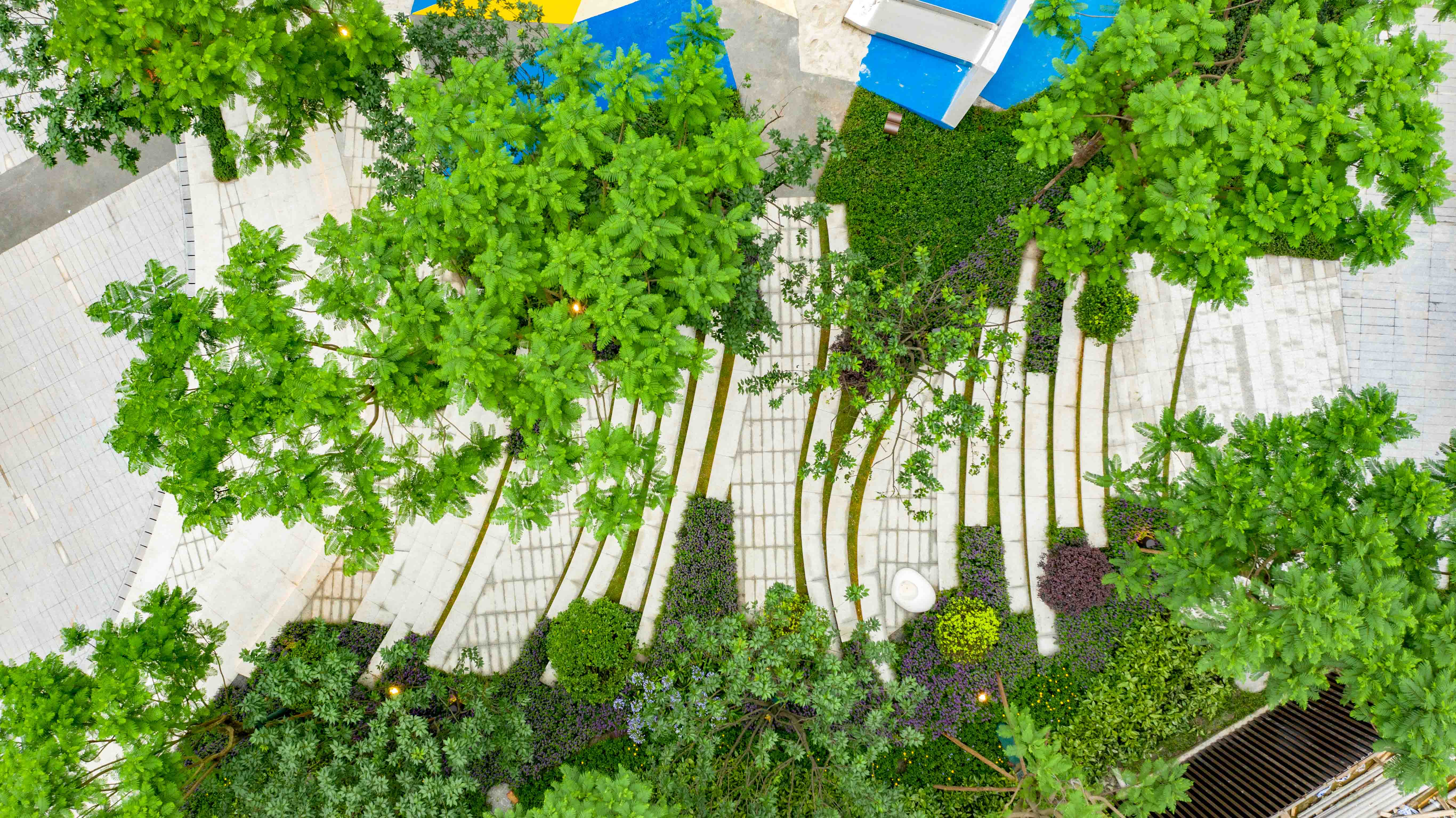 其次,我們用一條藍(lán)花楹花漫大道來點(diǎn)綴高差的鏈接,也為小區(qū)提供靚麗的風(fēng)景線。二者自然地將上下串聯(lián)起來,形成一條自然軸線。藍(lán)花楹盛開之時,浪漫的紫色也為綠意盎然的庭院增添一份彩色的美好。