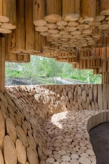 在展館中,陽(yáng)光穿透垂直的原木,照射在底層由木頭雕刻的有機(jī)形狀的座位與拋光混凝土圓形平臺(tái)之上,創(chuàng)造出柔和的光影效果。座位的空間復(fù)雜性通過(guò)不同的位置擺放突出周圍的迷人景色,并鼓勵(lì)游客根據(jù)自己的意愿尋找適當(dāng)?shù)奈恢?。?shí)際上,通過(guò)這種探索,人們可以發(fā)現(xiàn)展館不同的空間配置,可以小團(tuán)體聚會(huì),也可以和朋友聊天,可以和伴侶一起躺著欣賞浪漫的風(fēng)景,也可以在參觀藝術(shù)中心的時(shí)候獨(dú)自坐著冥想。