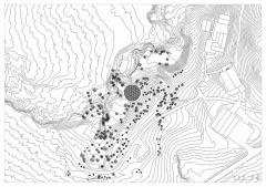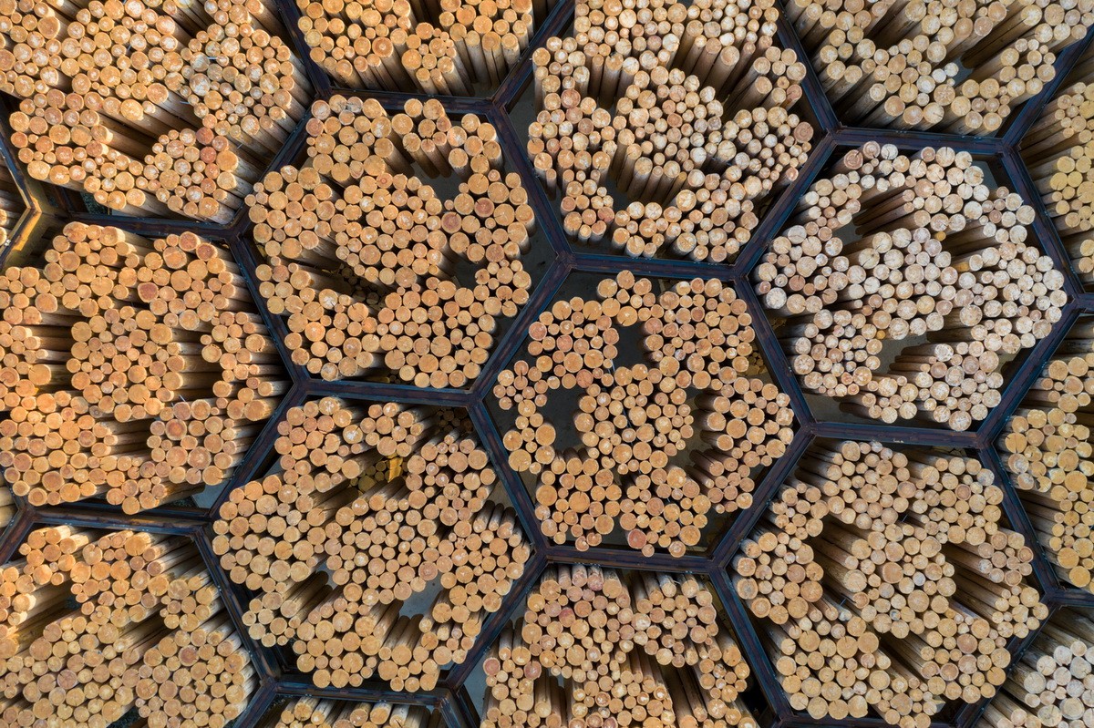 在七根鋼柱的頂部,采用耐候鋼六角形模塊化結(jié)構(gòu),將頂棚的原木組裝成圓形束孔。為了創(chuàng)造一個(gè)與周圍山丘融為一體的圓形地形,天篷的上表面被雕刻成曲線。屋頂?shù)脑O(shè)計(jì)靈感來(lái)自“toguna”,這是每個(gè)Dogon村落中最神圣的傳統(tǒng)的空間,是一個(gè)用木材和稻草建成的庇護(hù)所,其設(shè)計(jì)目的是保護(hù)建筑免受陽(yáng)光的照射,但同時(shí)也保證下面陰影空間的通風(fēng)。