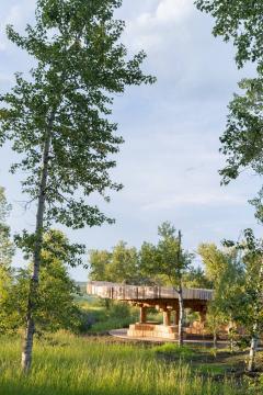 木亭作為Tippet Rise藝術(shù)中心的展亭,由弗朗西斯?凱雷(Francis Kéré)設(shè)計(jì),旨在為牧場(chǎng)的游客提供寧?kù)o的庇護(hù)所。木亭這一名字是為了喚起樹(shù)木生命結(jié)構(gòu)的重要內(nèi)層,游客聚集在這里,可以一邊交談一邊欣賞格羅佛溪岸邊的白楊樹(shù)和棉白楊,或者獨(dú)自坐下來(lái)冥想。