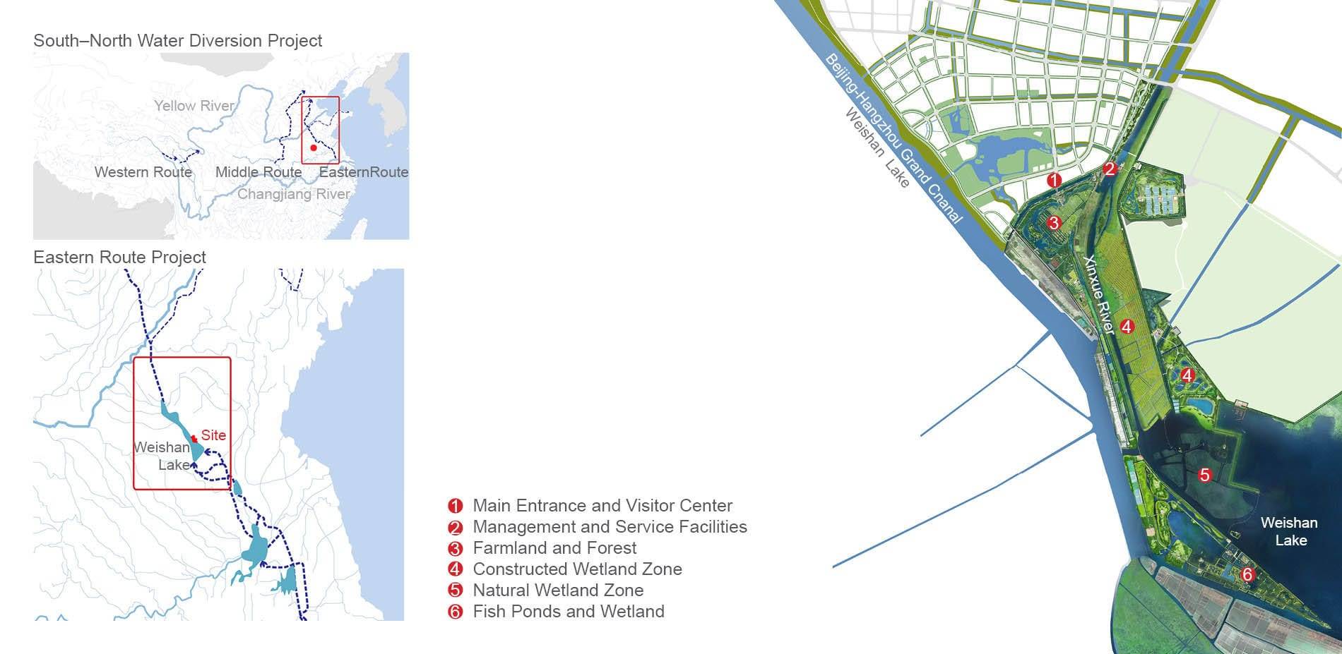 濕地公園位于山東省濟(jì)寧市微山縣南部,是中國南水北調(diào)工程?hào)|線的一部分,后者這一耗費(fèi)數(shù)十年打造的基建工程竣工之后將為中國北部帶來可靠的水源供給?;剡h(yuǎn)離主要的經(jīng)濟(jì)中心,同鄰近城區(qū)的交通連系受到很大限制,同時(shí)缺少旅游基礎(chǔ)設(shè)施和配套服務(wù)。該區(qū)域的生態(tài)和環(huán)境條件也相對(duì)沒有受到干擾,但與更廣大區(qū)域的生態(tài)聯(lián)系狀況不佳,基地內(nèi)農(nóng)業(yè)活動(dòng)也導(dǎo)致了某些區(qū)域嚴(yán)重的環(huán)境污染。這里有豐富的自然資源和多樣化的生態(tài)環(huán)境,但景觀特征相對(duì)模糊。