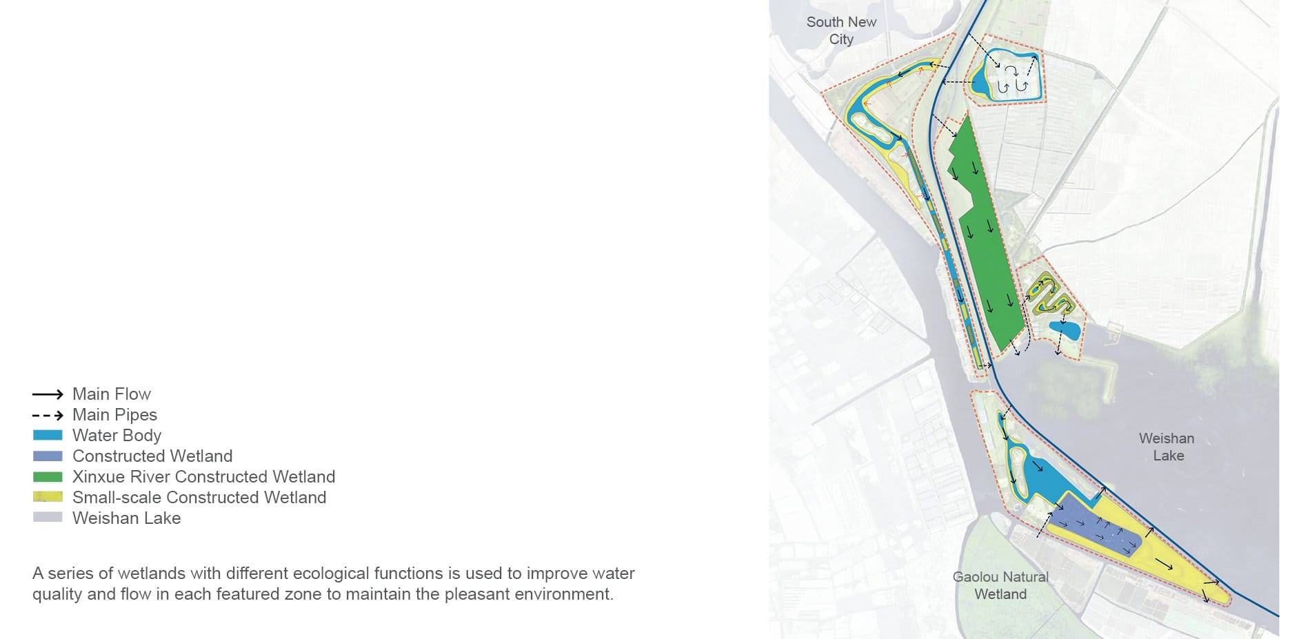 微山湖高洪水位和季節(jié)性水位波動(dòng)較大的現(xiàn)狀影響了基地的水文系統(tǒng),這為景觀設(shè)計(jì)帶來了極大挑戰(zhàn)。水系設(shè)計(jì)要仔細(xì)考慮地形、水池和河道構(gòu)造的現(xiàn)狀,打造高度防洪的水系網(wǎng)以及暢通無阻的水脈聯(lián)系。為了優(yōu)化水環(huán)境,在進(jìn)出口處設(shè)置凈水濕地,以確保流入和流出的水都是高度清潔的。與此同時(shí),植入最好的雨水管理系統(tǒng),最大化地控制和移除表面徑流帶來的潛在污染。