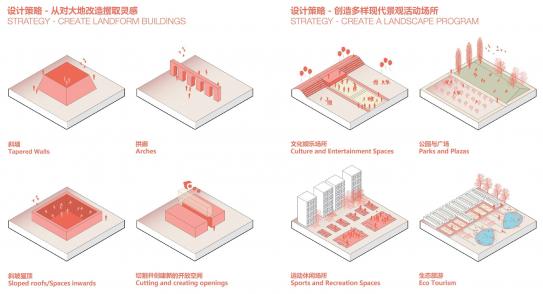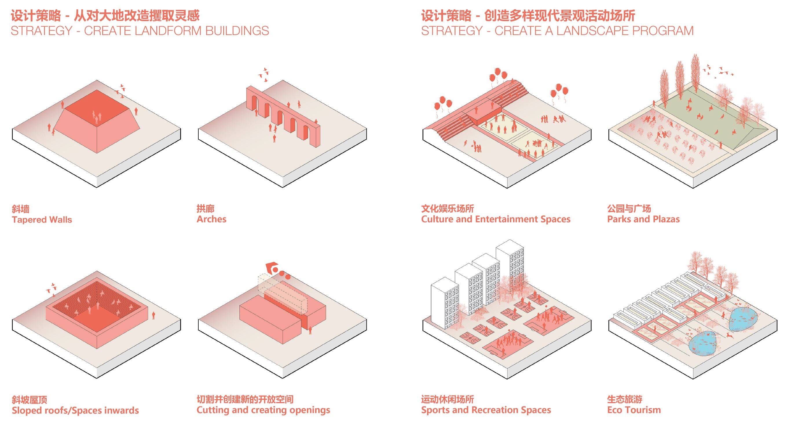 基于對西安傳統(tǒng)建筑語言的理解,雕塑或夯實景觀形成建筑的實踐或語言是顯而易見的,方案利用泥土的移動作為堆砌地形及塑造建筑的主要因素來反應當?shù)亟ㄖL格的傳承與發(fā)揚。同時,方案提出的三個策略為場地12個主要地區(qū)的串聯(lián)建立了設計語言,包括陜商故里、水晶明池、龍鱗濕地、藝術博物館、農(nóng)業(yè)旅游等。