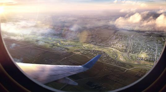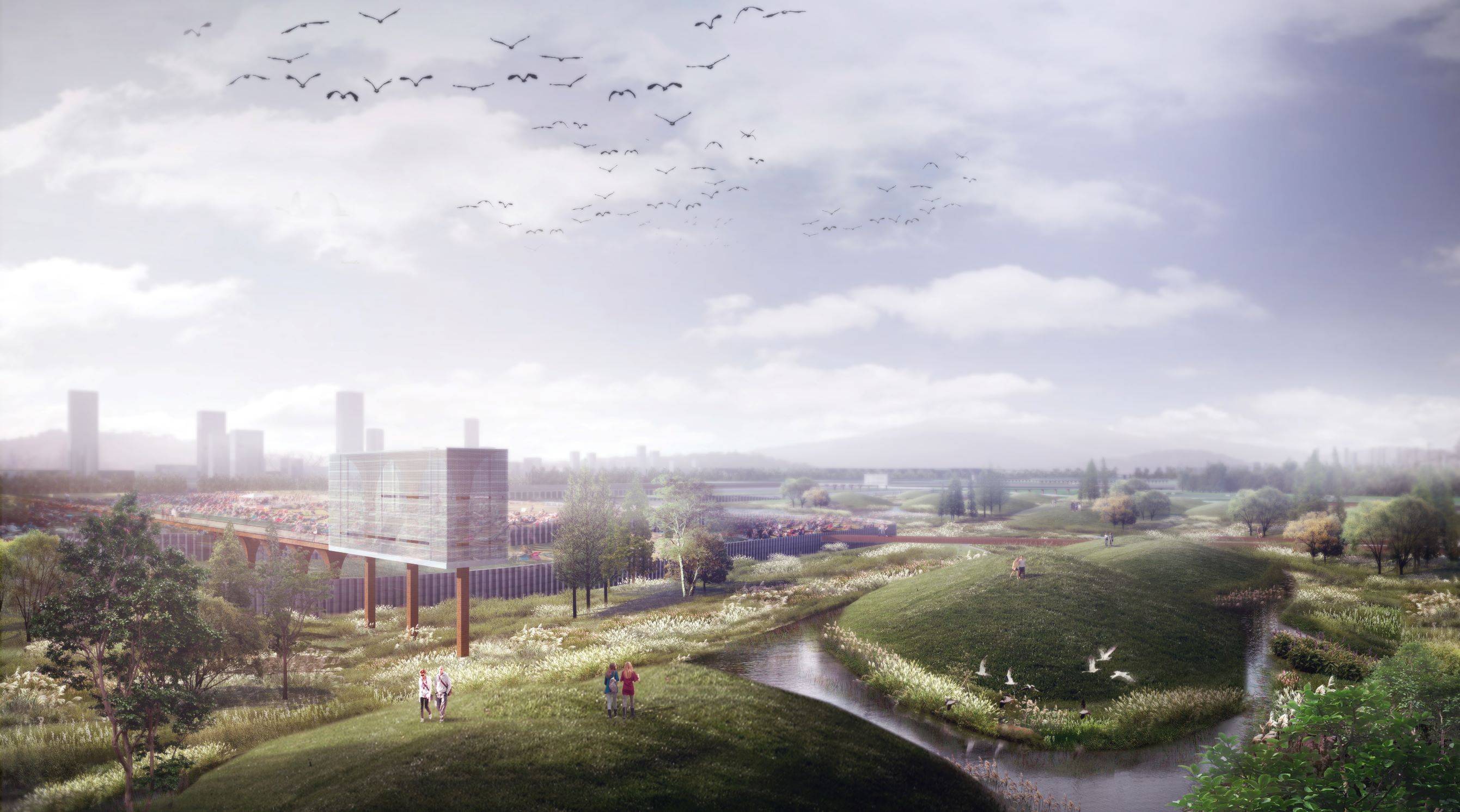綜合考慮歷史原因與自然氣候環(huán)境因素,Gossamer提出在河流廊道(涇河)與城市(涇河新城)之間建立一個新的親水界面。設計方案“粼”島位于國家政策“一帶一路”的中心軸線上,通過為西安打造一個活躍的生態(tài)脊梁和世界級濱水區(qū),為河流廊道的開發(fā)與修復提供了模板。