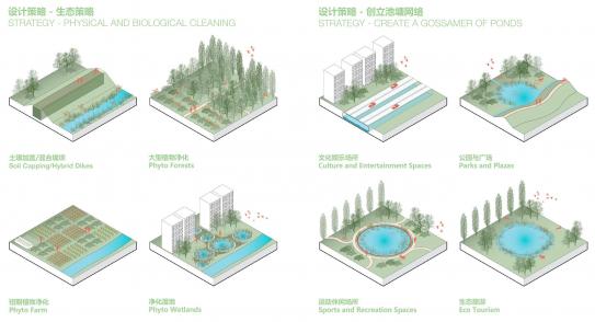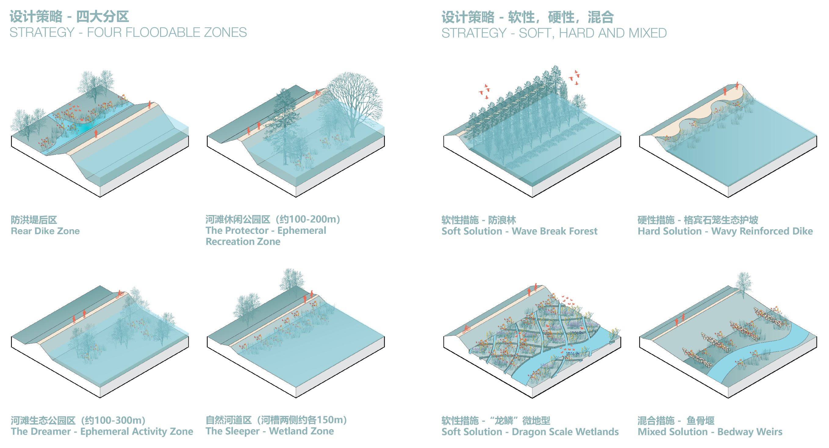 方案提出三個策略作為設計概念框架的回應:“水岸重生”作為對氣候變化造成的雨洪問題的響應,“激活生態(tài)”用于支持場地的排洪系統(tǒng)、雨水管理以及促進生物多樣性的提高,“彰顯人文”則用于反應西安豐富的歷史傳統(tǒng)與文化背景。這三個策略作為一系列適用本地的最佳實踐,包括多樣性的堤岸開放空間與活動場所,對傳統(tǒng)中國村落布局的梳理、以及對當?shù)亟ㄖ愋瓦M行了全新詮釋。