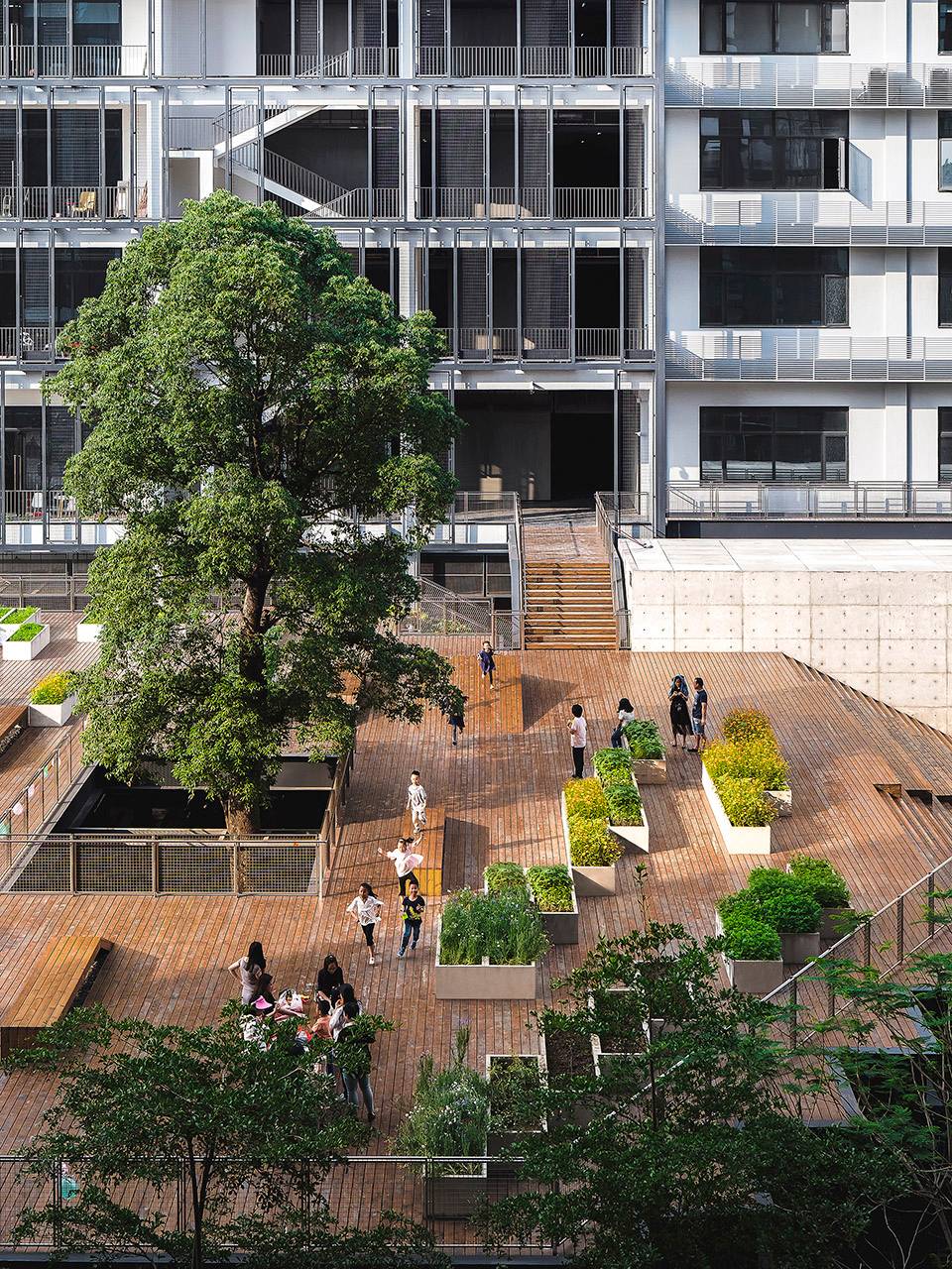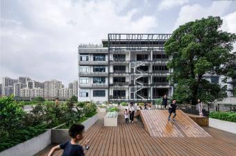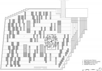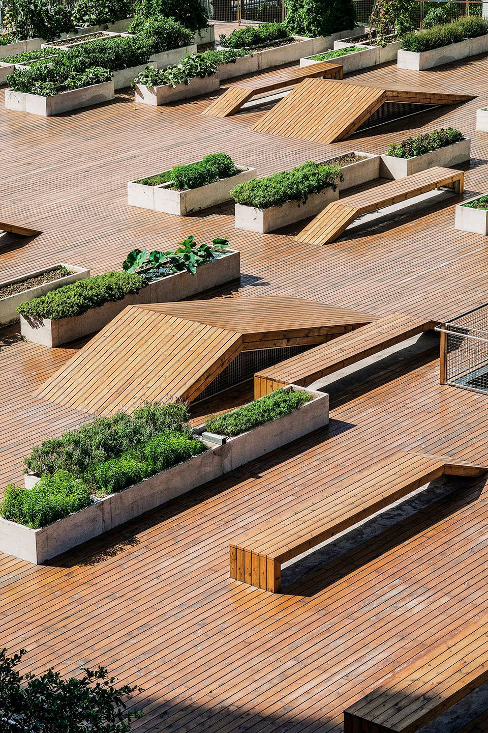 在原有的園區(qū)整體布局中,內(nèi)庭院的西側(cè)是一個室外停車場。為了改善庭院的空間效果和保留停車功能的需求,停車場的上方增添了景觀大平臺。通過臺階的設(shè)置,大平臺成為內(nèi)庭院空間的延續(xù),從而形成不同標(biāo)高的公共空間體系,而臺階也成為內(nèi)庭院舉辦戶外活動時的觀眾座椅。平臺上布滿了錯落有致的混凝土種植槽,不同喜好的人栽種不一樣的農(nóng)作物和灌木花草,形成有趣生動的景觀。平臺上的大洞口為下面的停車場提供良好的采光,而洞口中間的香樟大樹也為停車空間提供綠意。