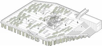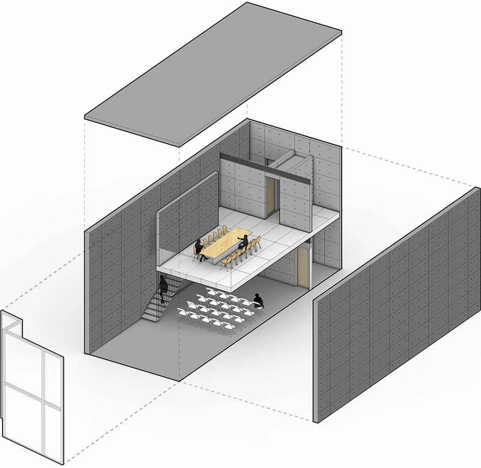 此外,清水混凝土材質(zhì)的種植體驗(yàn)館坐落在大平臺的東北角,它為種植愛好者提供學(xué)習(xí)交流的場所。一層作為公共功能包含了展示、交流和講座的功能,二層則是種植操作空間和培訓(xùn)功能。兩層高的植物綠墻展示著各式各樣的植物,小小的兩層通高空間成為親密而有互動的交流學(xué)習(xí)場所。內(nèi)部懸空的樓梯與懸掛著的樓板讓這小巧的建筑顯得靈巧。同時,建筑內(nèi)不同標(biāo)高的兩個入口使大平臺、室內(nèi)空間和內(nèi)庭院三者之間建立更緊密的聯(lián)系。