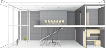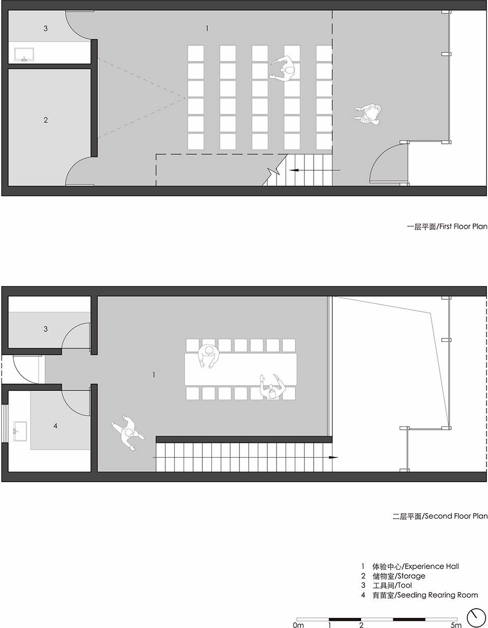 ▼一層作為公共功能包含了展示、交流和講座的功能,二層則是種植操作空間和培訓(xùn)功能
