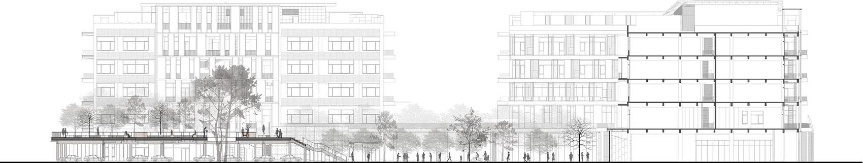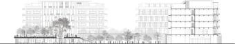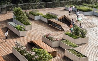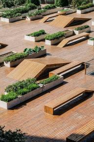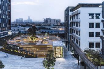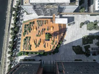 ▼內(nèi)庭院的西側(cè)是一個室外停車場,為了改善庭院的空間效果和保留停車功能的需求,停車場的上方增添了景觀大平臺