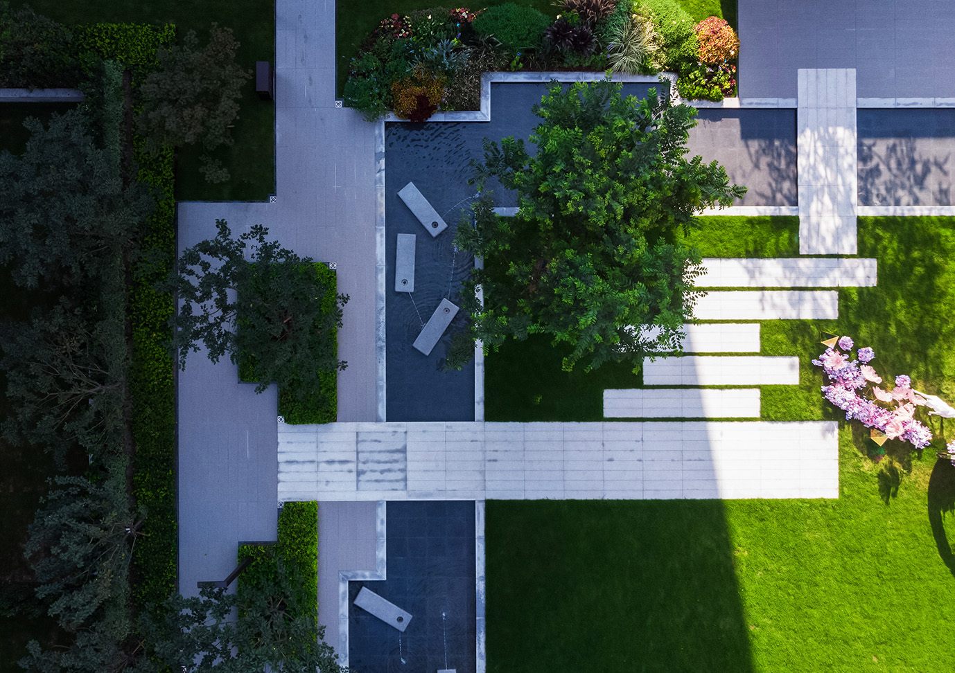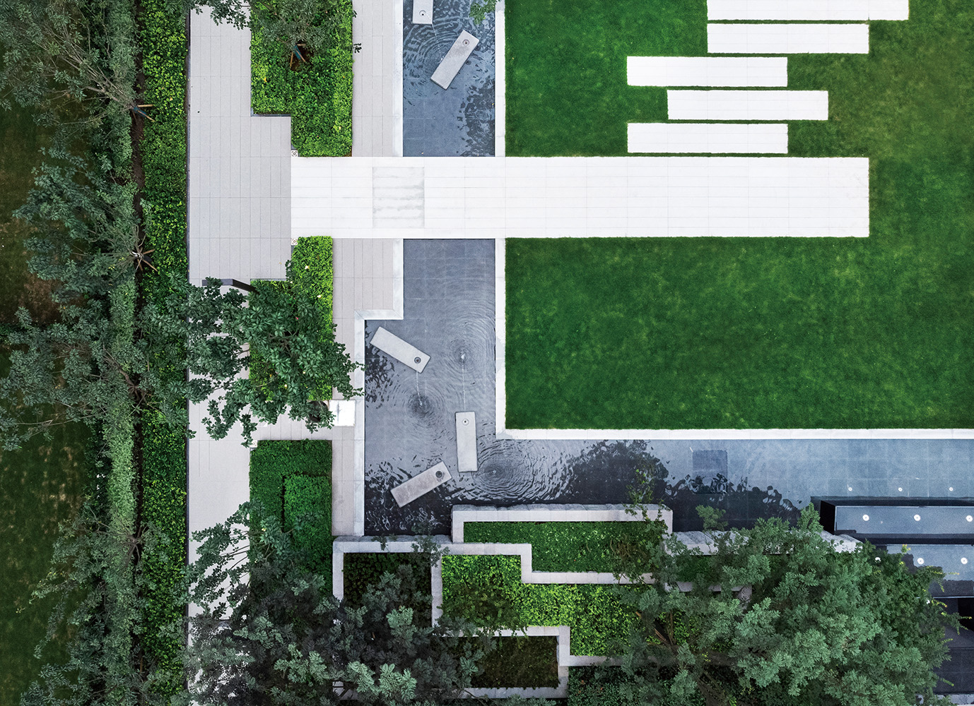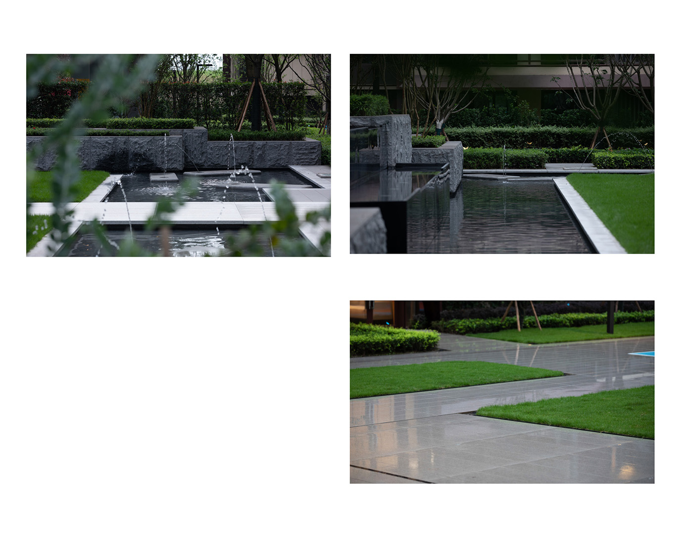 水院在草坪的中央,通過橋連接,營造出一種度假宗教式的沉寂體驗,樓王前抬高1米5的景觀會客廳,水流順著外墻流入水槽,呈現(xiàn)瀑布的景象,保持與外界自然的連通。人通過圓形噴霧雕塑望向遠(yuǎn)處就是天空“一個人真正的幸福并不是待在光明之中。從遠(yuǎn)處凝望光明,朝它奮力奔去,就在那拼命忘我的時間里,才有人生真正的充實。