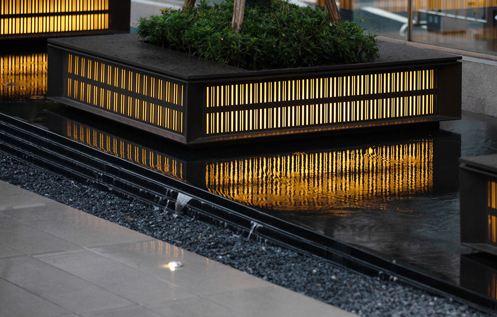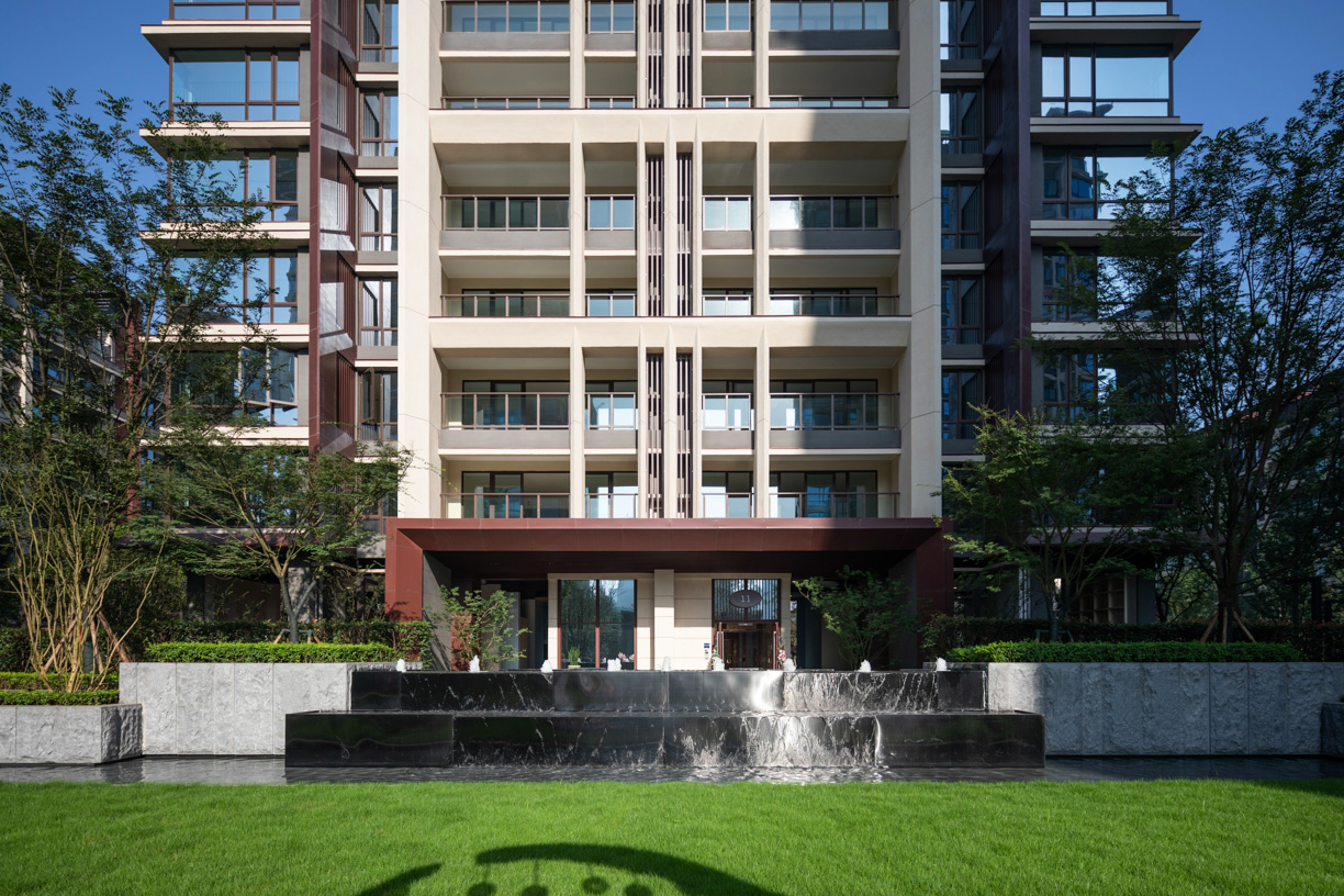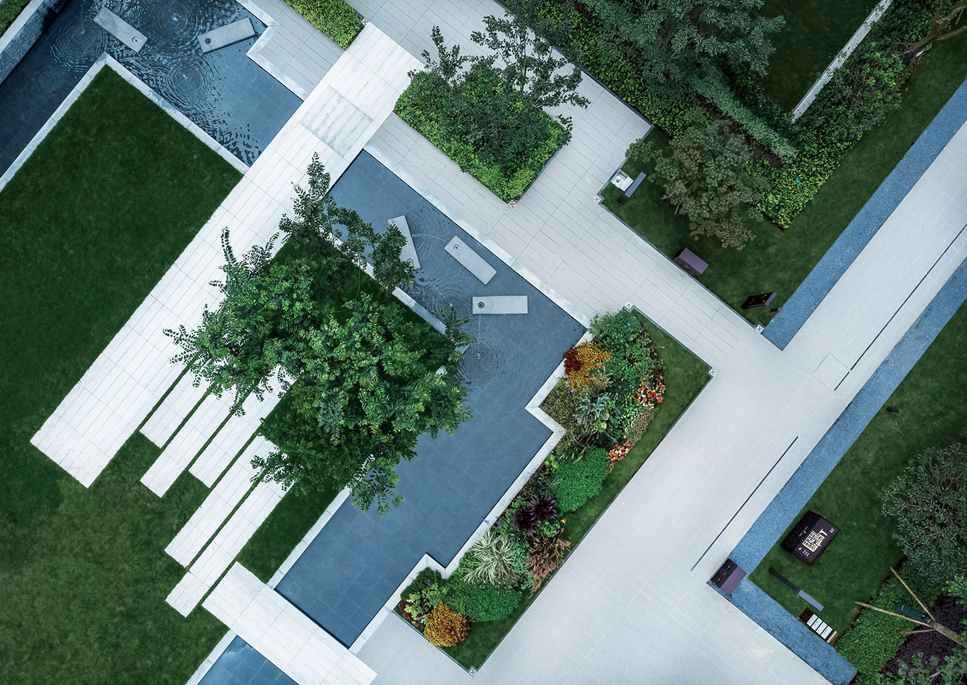 水院在草坪的中央,通過橋連接,營造出一種度假宗教式的沉寂體驗,樓王前抬高1米5的景觀會客廳,水流順著外墻流入水槽,呈現(xiàn)瀑布的景象,保持與外界自然的連通。人通過圓形噴霧雕塑望向遠(yuǎn)處就是天空“一個人真正的幸福并不是待在光明之中。從遠(yuǎn)處凝望光明,朝它奮力奔去,就在那拼命忘我的時間里,才有人生真正的充實。