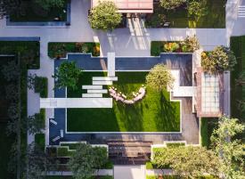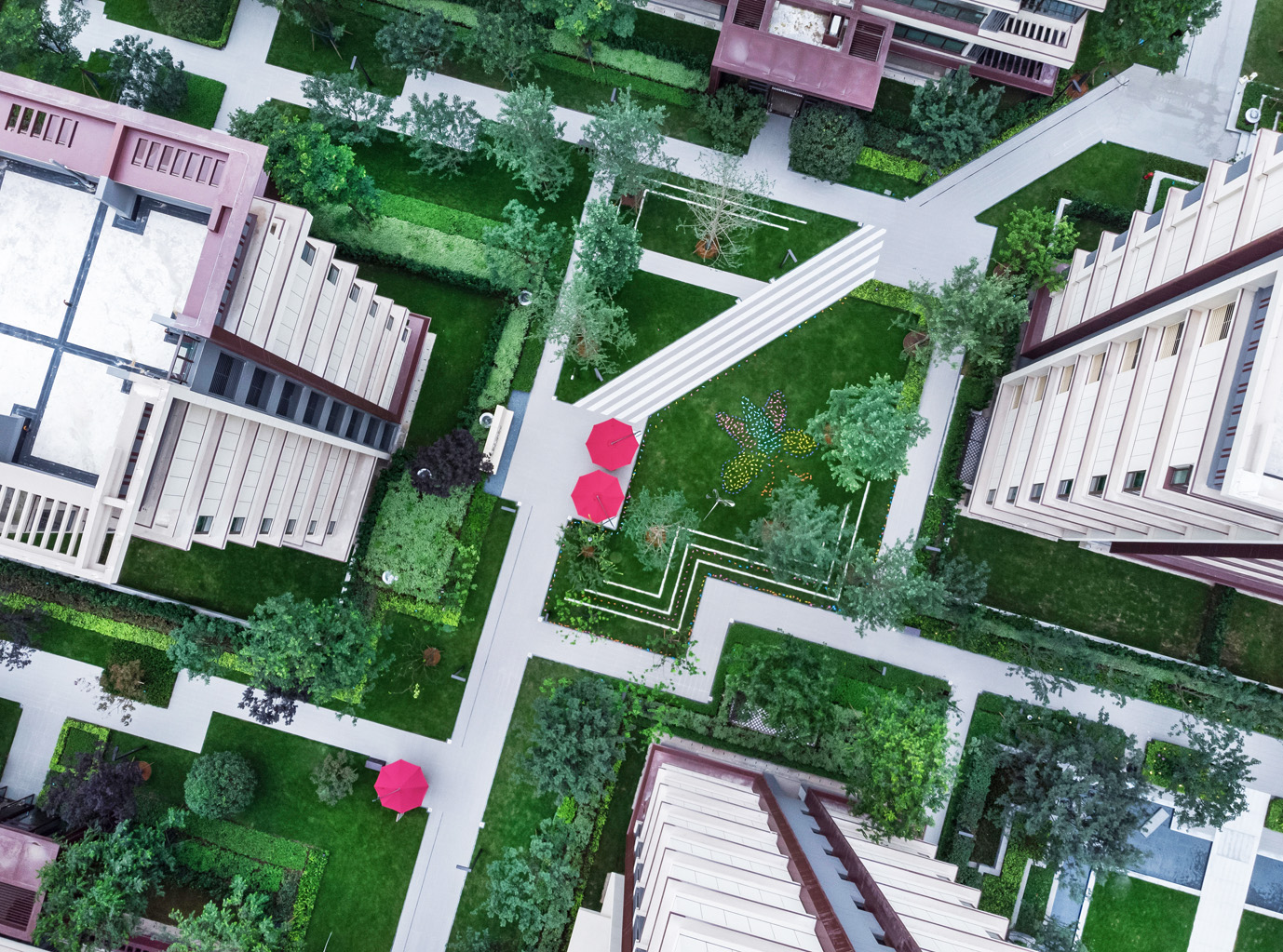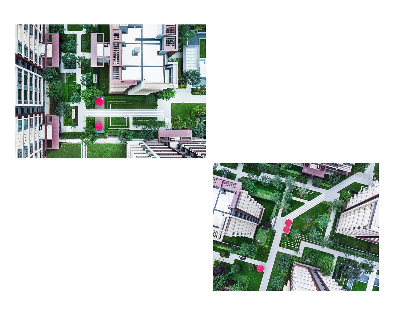 洋房花園特意流出一些留白的空間——設(shè)置一些沒有明確功能的留白空間,讓其成為一個聚集人群的契機,有時是從地面到斜坡上的“回轉(zhuǎn)廊道”,有時是人們在途中停留片刻的消防登高“滯留地”,一個個埋沒在街區(qū)中,在充滿功能性和合理性的社區(qū)空間的“透風(fēng)口”.
