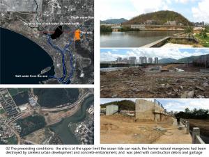 場地面積為10公頃,位于三亞市中心的三亞河?xùn)|岸。經(jīng)研究發(fā)現(xiàn)場地內(nèi)陸和海水交匯處的生態(tài)狀況十分脆弱。與三亞水系普遍狀況一樣,這里的水也被城市徑流污染了。高聳的混凝土墻圍繞著這片10公頃的土地,場地里遍地都是已被政府叫停的建設(shè)項目的垃圾。一條主干道從旁邊穿過,道路與水面間9米的陡坎讓市民無法接近水面。