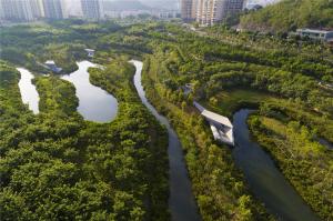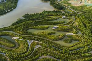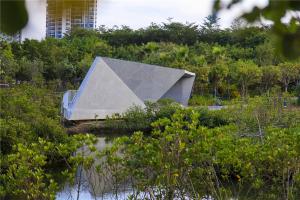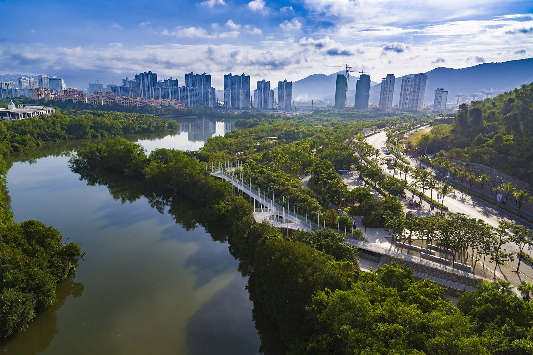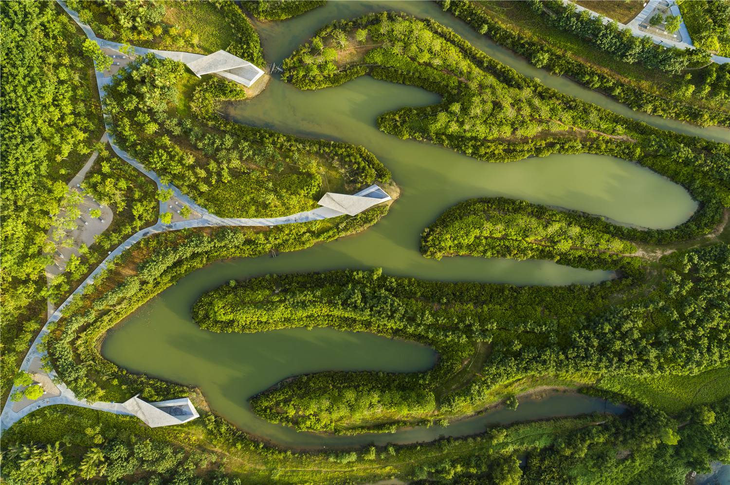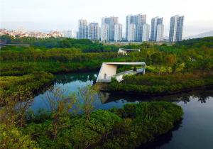 在三亞市中心,短短三年內(nèi),一片混凝土防洪墻內(nèi)的荒蕪?fù)恋乇怀晒Φ匦迯?fù)成一個郁郁蔥蔥的紅樹林公園,在這里,自然和人們和諧地共享著海潮與淡水的交融。項目遵循自然風(fēng)水的生態(tài)過程,利用指狀相扣的紅樹林混交林島來加快紅樹林修復(fù),塑造出既美麗又生態(tài)的景觀。