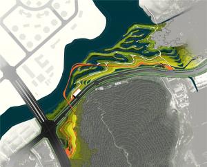 臺地和生態(tài)廊道: 利用道路與水面間的9米高差,建立一系列的臺地和生態(tài)廊道系統(tǒng),截流并凈化來自城市的地表徑流,高低錯落的公共空間布置其間。