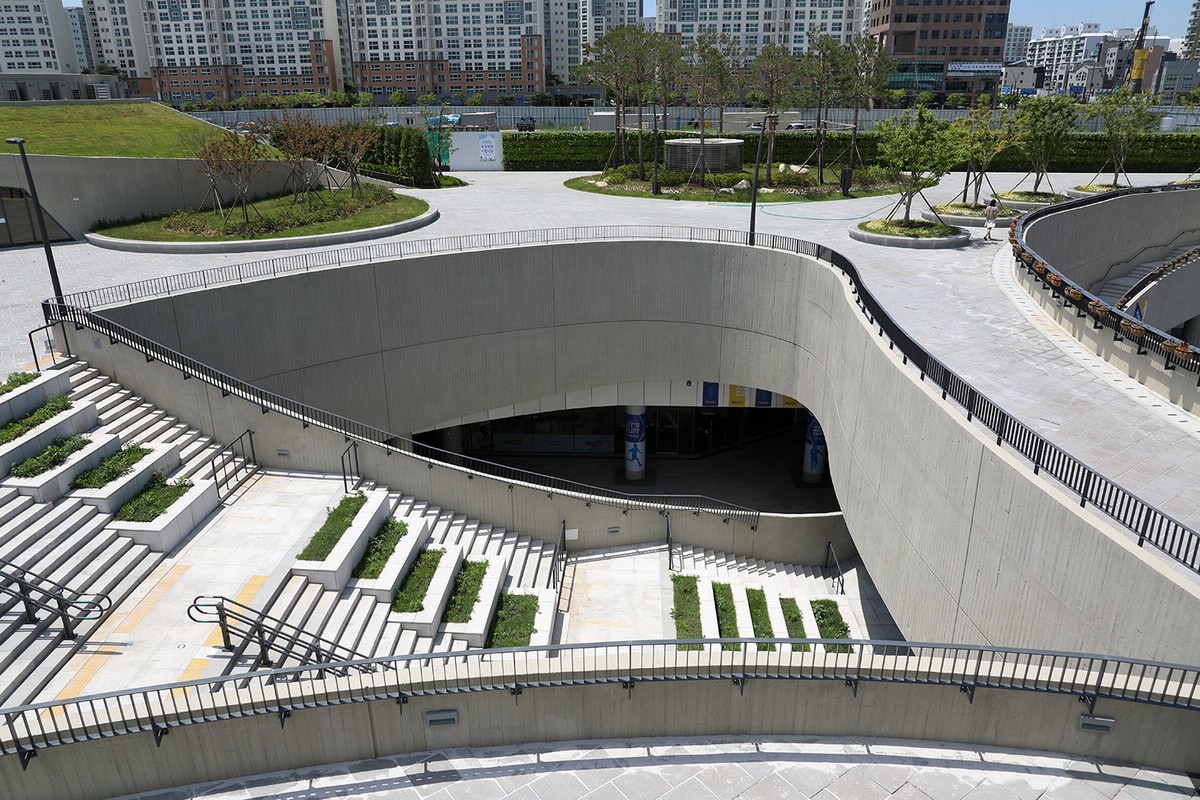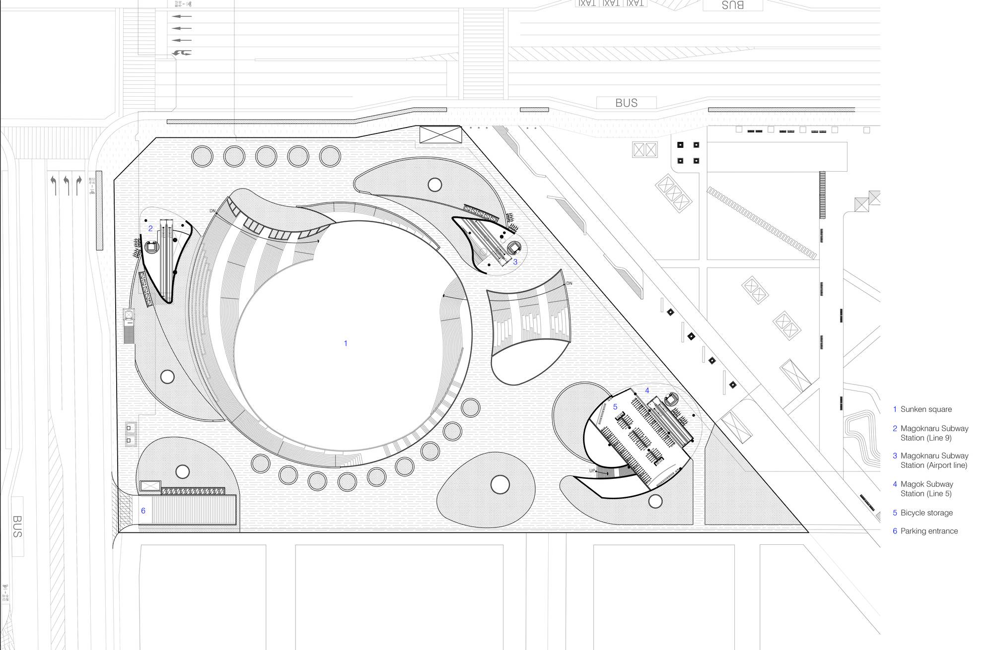 該項(xiàng)目位于麻谷新城市的中心,是連接9號(hào)線的麻谷渡口站、5號(hào)線的麻谷站和機(jī)場(chǎng)鐵路的麻谷渡口站的交通點(diǎn)。在地面層,該站點(diǎn)位于南北方向的麻谷中央路線旁和東西方向的麻谷中央5號(hào)線。該基地的西南部有綠地,東北部有首爾植物園。此外,它周圍是醫(yī)院、購(gòu)物中心、辦公室和研究中心,為附近的住宅提供支持。