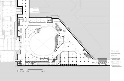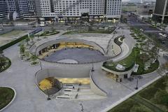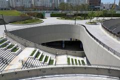 廣場(chǎng)是一個(gè)靈活的城市空間,能夠響應(yīng)周圍環(huán)境中人們的移動(dòng)路線,而不是提供固定程序來(lái)滿足這些服務(wù)。這個(gè)直徑60米的下沉式廣場(chǎng)建在三個(gè)車站的交界處,沿著車站的出口設(shè)計(jì)地標(biāo)和地下層,營(yíng)造出空間體驗(yàn)。露天廣場(chǎng)可以舉辦各種活動(dòng),比如事件、表演和展覽。