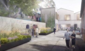 翻新后的社區(qū)中心采用了新的外立面處理,整合了戶外垂直綠化區(qū)域的晾衣繩與新的社區(qū)菜園區(qū)域。