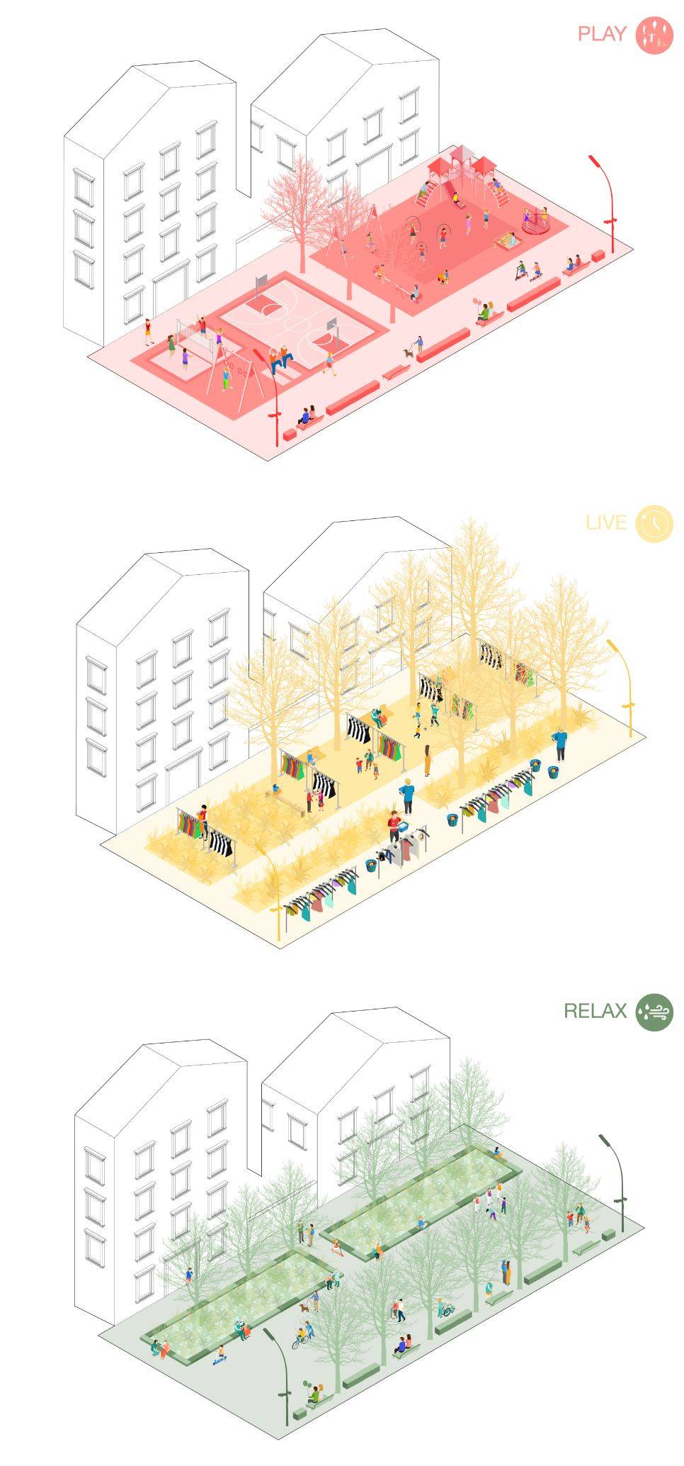 LOOP 為場(chǎng)地設(shè)計(jì)了一條1公里長(zhǎng)的環(huán)形步道,其中包含6個(gè)令人難忘的微型空間,目的在于提升這個(gè)1km長(zhǎng)步道的生活體驗(yàn)。為了打造一個(gè)真正獨(dú)特的社區(qū)公共空間,設(shè)計(jì)提供了一系列溫馨的令人感動(dòng)的活動(dòng)場(chǎng)所,其中包括晾衣設(shè)施,棋牌桌,小花園,歷史角,藝術(shù)裝置,健身器械以及雨水花園。Gossamer 同時(shí)也考慮了整個(gè)場(chǎng)地的流通性以及對(duì)場(chǎng)地的可達(dá)性、臨街店鋪、照明設(shè)施、私密空間、安全性、垃圾分類與回收等相關(guān)問題進(jìn)行了設(shè)計(jì)的改善提升。