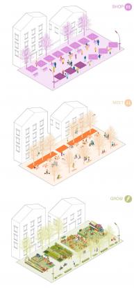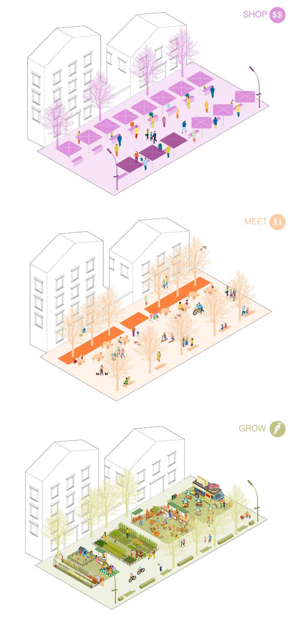 林蔭道成為附近各個(gè)社區(qū)的主要通行空間,一系列雨水花園為毗鄰的私密起居室空間提供了遮蔽并改善了外觀。現(xiàn)狀梧桐樹被修復(fù)后重新種植在林蔭大道上,在炎熱的夏季為行人提供綠蔭。