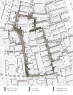 三個(gè)住宅社區(qū)交匯于一條狹窄的里弄,通過對(duì)該里弄公共區(qū)域的照明設(shè)施、標(biāo)識(shí)系統(tǒng)進(jìn)行重新整合與設(shè)計(jì),提升該片區(qū)的可達(dá)性與安全性。