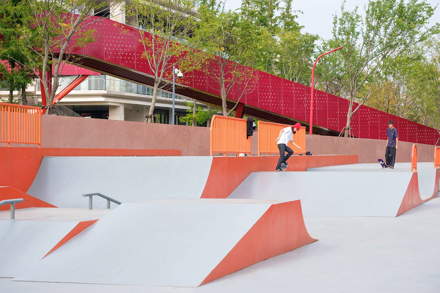 原本的堤壩坡度為1/2至1/3,在這樣的坡度上居民很難獲得可活動(dòng)的空間。為了解決這樣的困局,項(xiàng)目團(tuán)隊(duì)設(shè)計(jì)了不同特征的三層沿江帶狀空間。連續(xù)的坐墻與草臺(tái)定義了靠江一側(cè)的漫步道,中間一層則提供跑步、騎行的空間,亦是江心洲環(huán)島防汛道路,同時(shí)引入極限運(yùn)動(dòng)場地。最上一層空間通過注入兒童活動(dòng)功能及外擺休憩功能與商業(yè)建筑產(chǎn)生聯(lián)系。