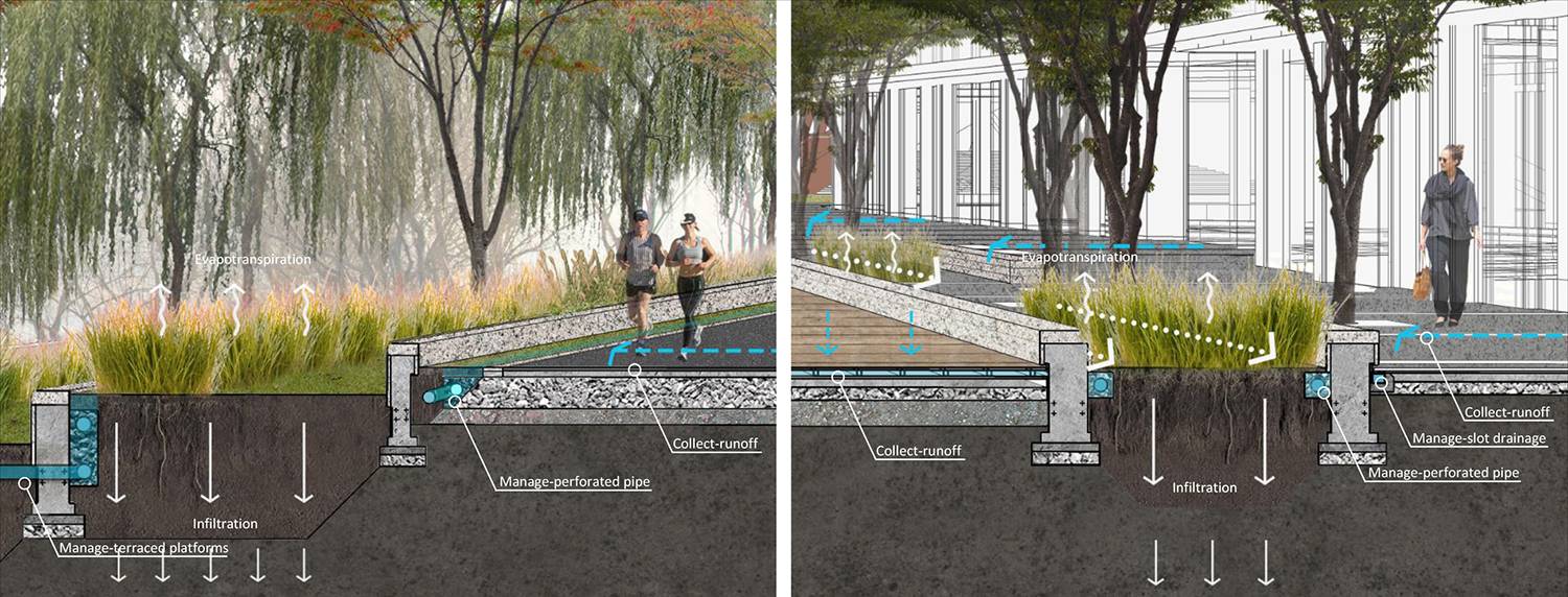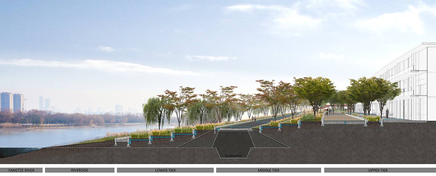 認(rèn)識(shí)到了這些生態(tài)缺陷,我們希望通過景觀設(shè)計(jì)手段加以改善。在堤壩坡面基礎(chǔ)上,利用現(xiàn)有的植草格的孔隙,覆蓋一層新的種植土層,這樣就有了更多植被品種生長的條件,進(jìn)行植被修復(fù),在壩頂?shù)纳虡I(yè)建筑兩側(cè),我們片植了兩片水杉林向南北側(cè)延伸,與相鄰的場地融合,這也是島內(nèi)最常見的植物特征。同時(shí),以現(xiàn)有的混凝土格梗為基礎(chǔ),面向江面形成新的臺(tái)階狀的地表形態(tài),采用規(guī)整的方式鋪植草坪與當(dāng)?shù)刈畛R姷暮影吨脖?。這樣就大大增加了雨水下滲的機(jī)會(huì),既防止了水土流失,同時(shí)也形成了雨水滯留凈化系統(tǒng)。
