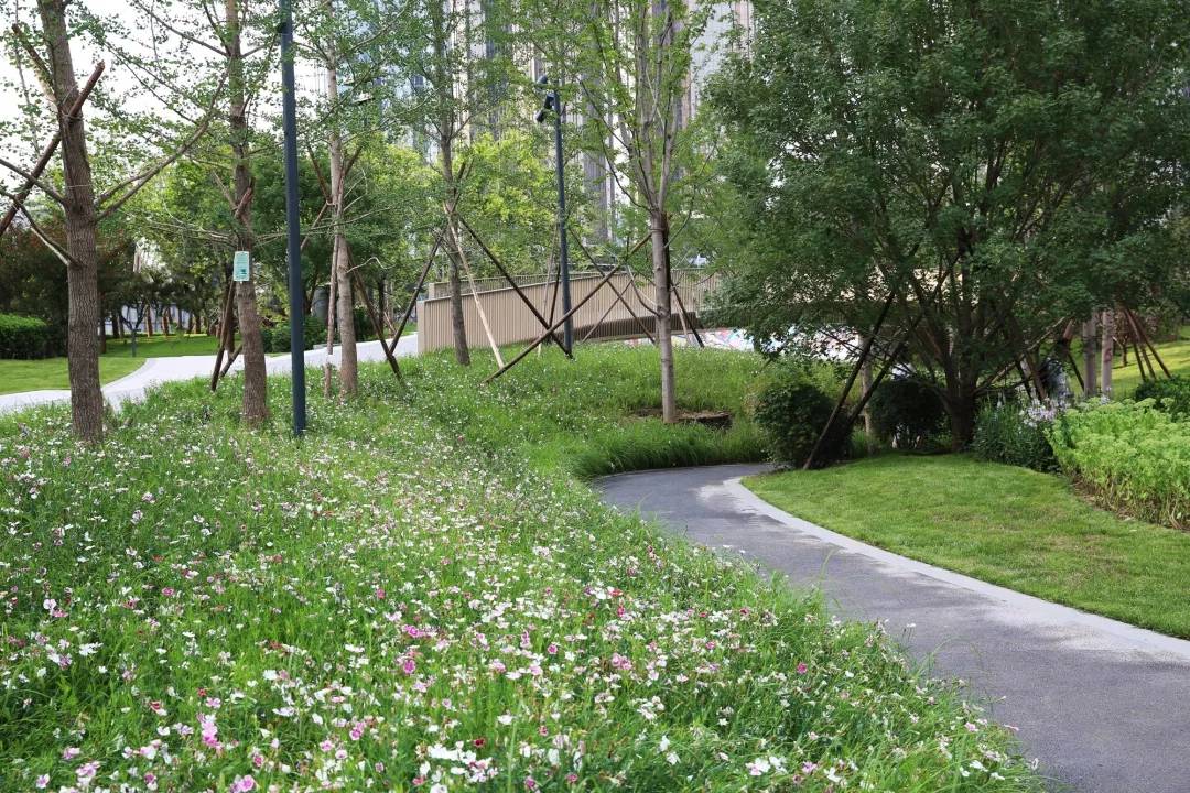 如果你是攝影或運動愛好者,那公園最東側(cè)的生態(tài)綠廊一定讓你流連忘返。以“嬉夏”為植物主題交錯而成的綠色廊道、種滿櫻樹的山坡、搭配精巧的特色景觀橋、豐富的花卉綠植和平坦的微地形使生態(tài)主題區(qū)更具開放性和觀賞性。每當(dāng)櫻花盛開的季節(jié),放眼遠(yuǎn)眺滿山粉云繚繞,美不勝收。