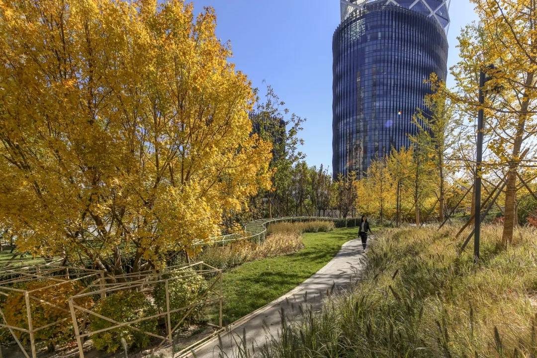 一路往東而至的藝術(shù)綠廊,則為整個朝陽區(qū)的藝術(shù)活動和戶外放松提供了天然的舞臺。以“幻彩”為主題的綠廊由季相豐富的植物編織而成,紫葉稠李、花葉復(fù)葉槭、沙棗、金葉國槐等常年彩葉植物在耐寒抗旱同時,更為園林帶來持久豐富的色彩,搭配下沉的覆土建筑——“四季客廳”,形成一個錯落有致且極具美感的多彩花園。