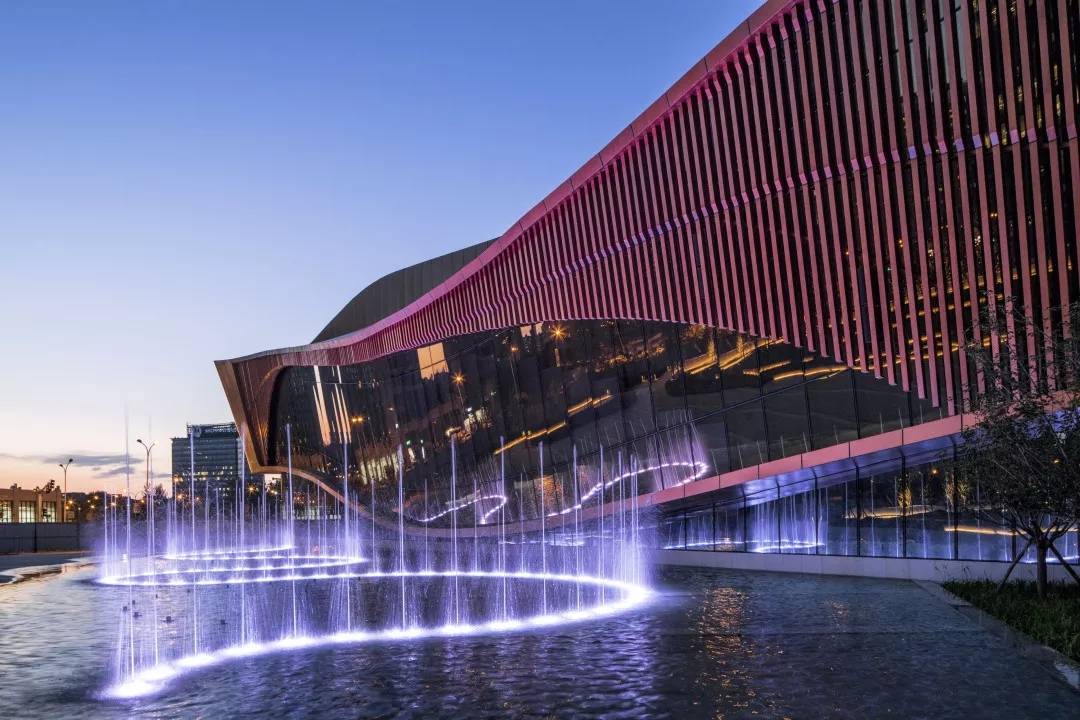 廣場上,音樂噴泉與頗具設(shè)計感的建筑交相輝映。夜幕降臨,音樂響起,噴泉隨之律動,線條曼妙。主題雕塑在燈光的投射下,色彩變幻,線條交錯,傳達(dá)出現(xiàn)代美感。同時,廣場、道路均采用了新興材料和工藝進(jìn)行異形加工與鋪裝,兼具裝飾和排水的作用,展現(xiàn)了創(chuàng)意與科技的完美融合。