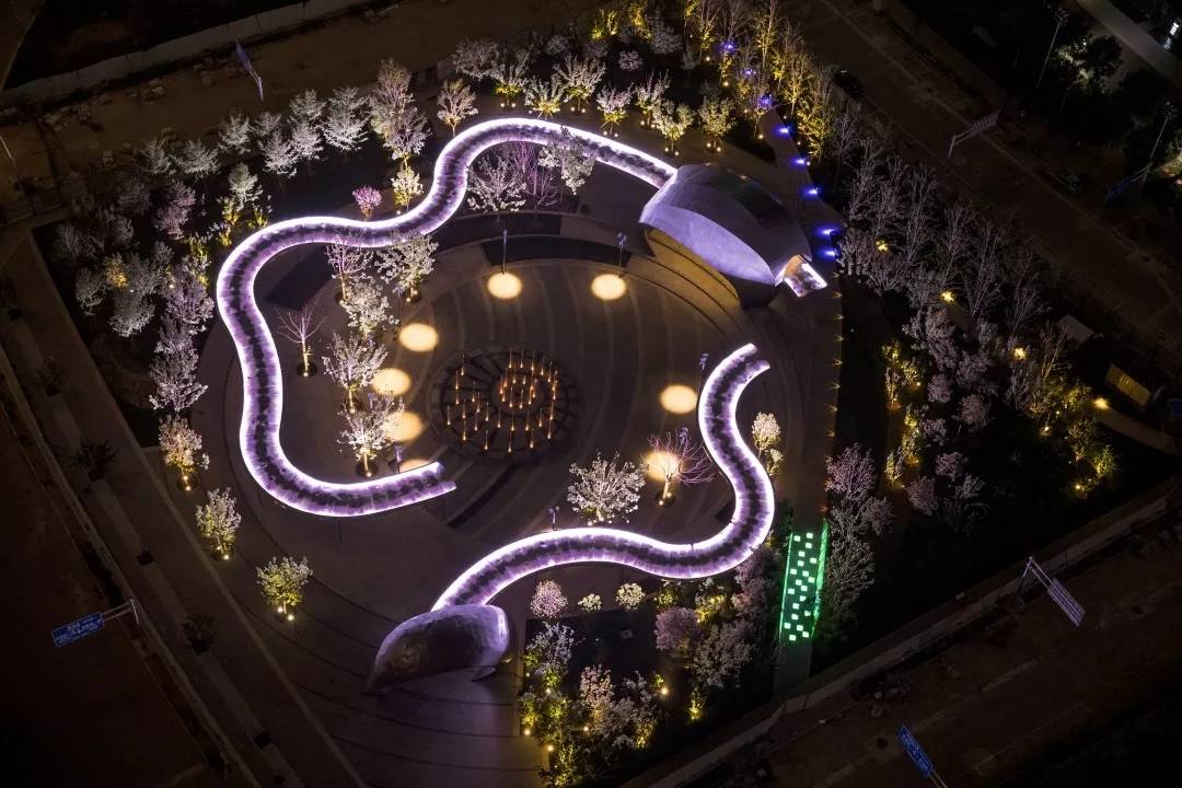 除了運用膠粘石內(nèi)嵌夜光材料工藝打造的“星空步道”,園林在空間景觀、建筑裝飾、地面鋪裝各方面都延續(xù)了“星空”的概念,夜幕降臨后,從入口的“星河山丘”到“星夜展場”再到“星云廣場”,一路走來讓人恍惚感覺是在“星空漫步”,神秘而美麗。
