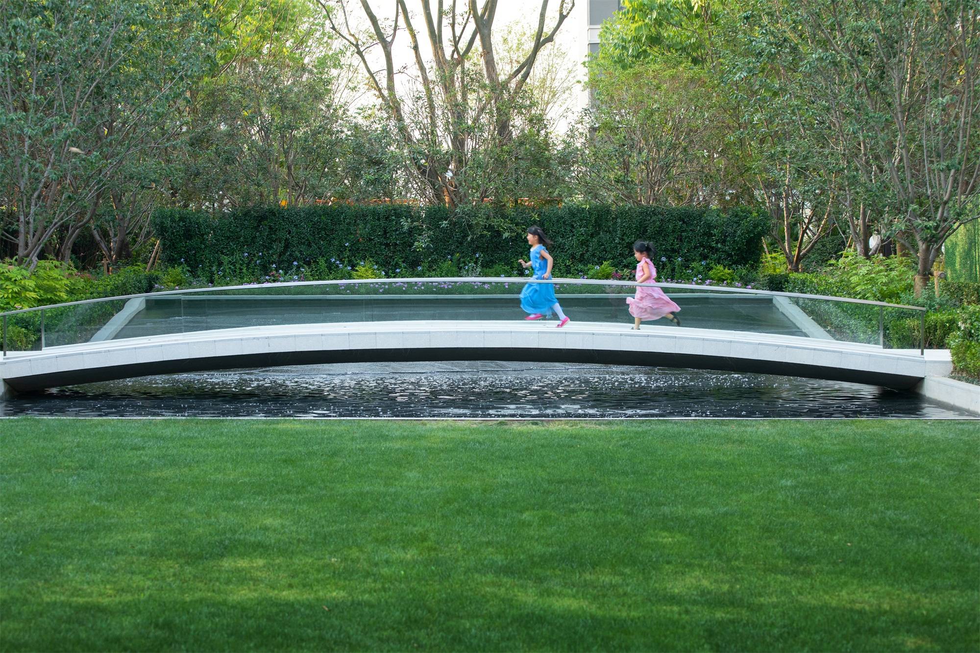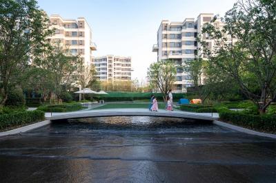 融合江南水鄉(xiāng)特色,水波形的軸線水景點(diǎn)明伴水而居的水鄉(xiāng)特色,跨水過(guò)橋的園路形式充滿地域特色與趣味性。