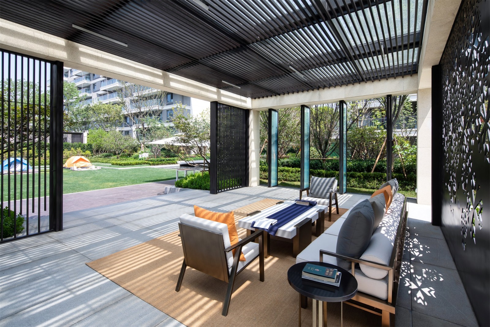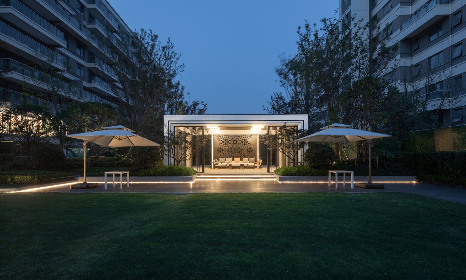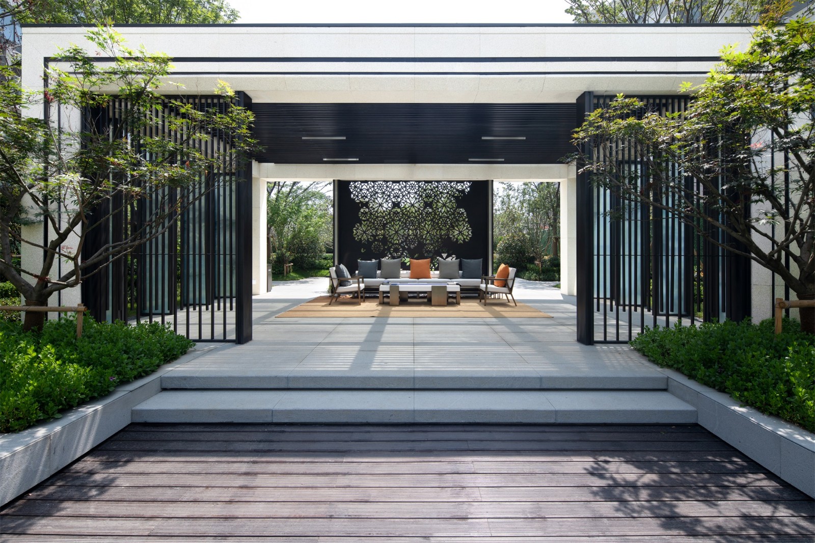 賦予每個(gè)細(xì)節(jié)靈魂。在景觀廊架中雕刻鏤空?qǐng)D案的鐵藝屏風(fēng)將景觀空間進(jìn)行分隔,從而打造最適宜的立面尺度,豐富空間層次感。