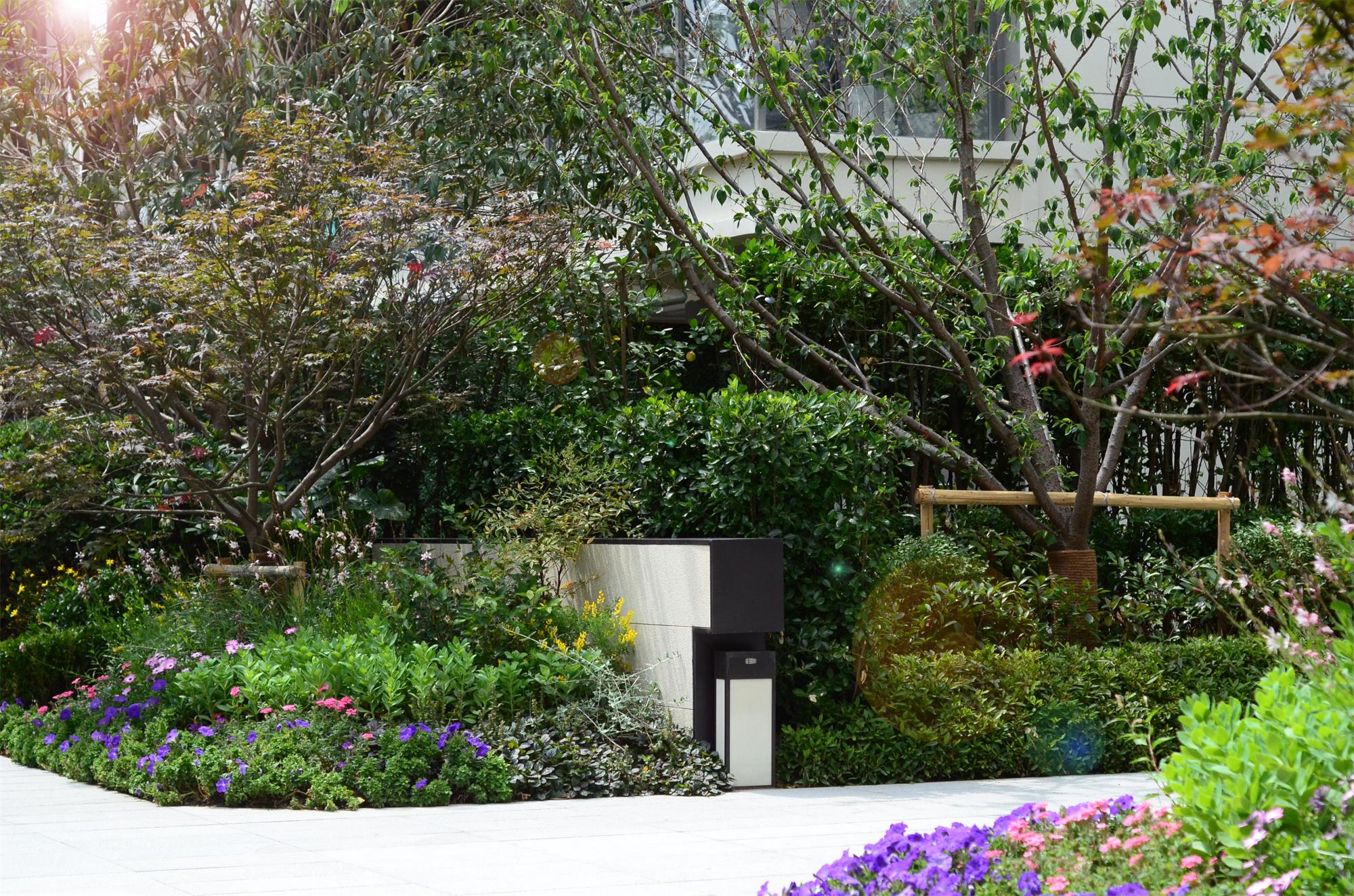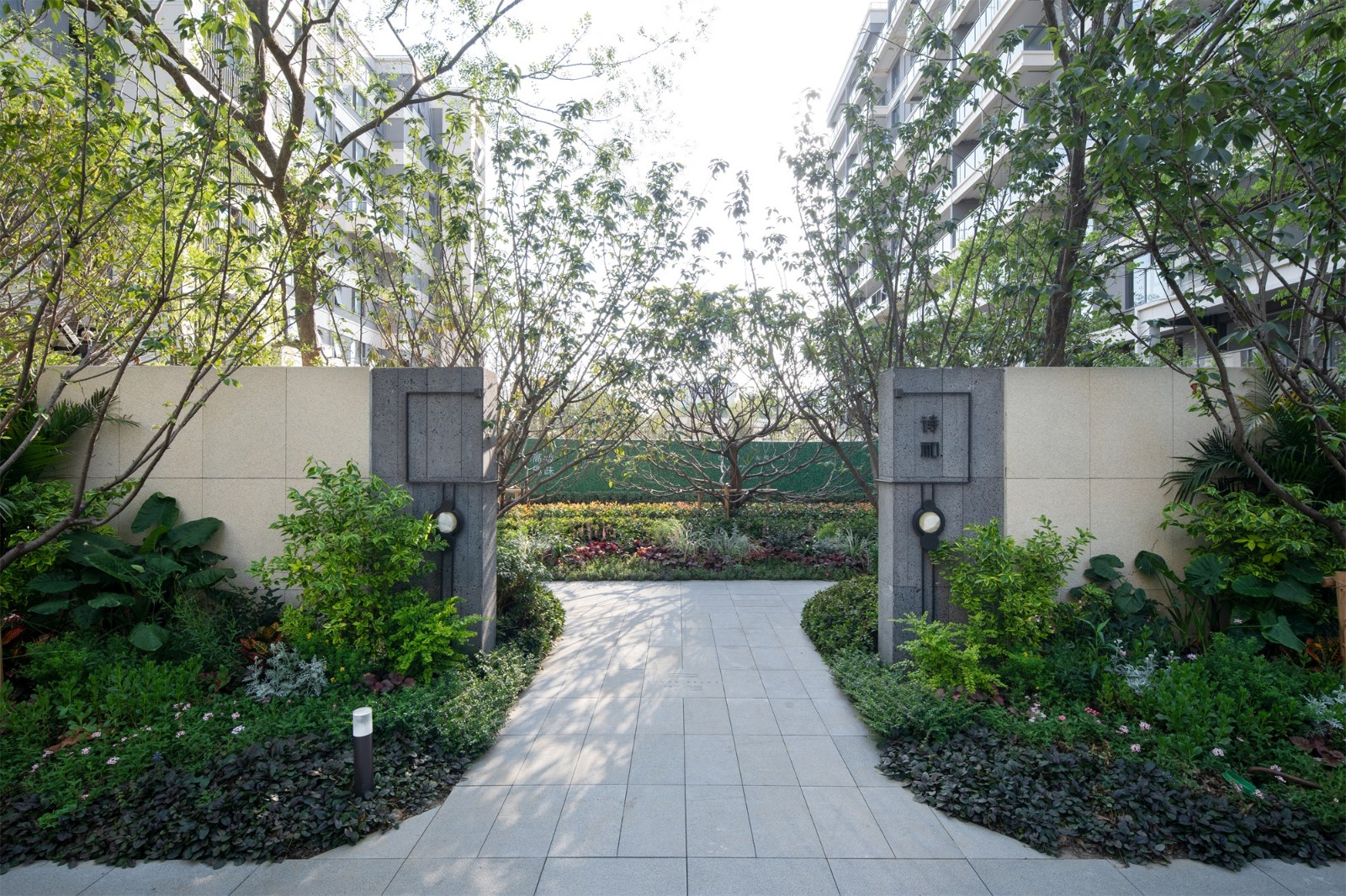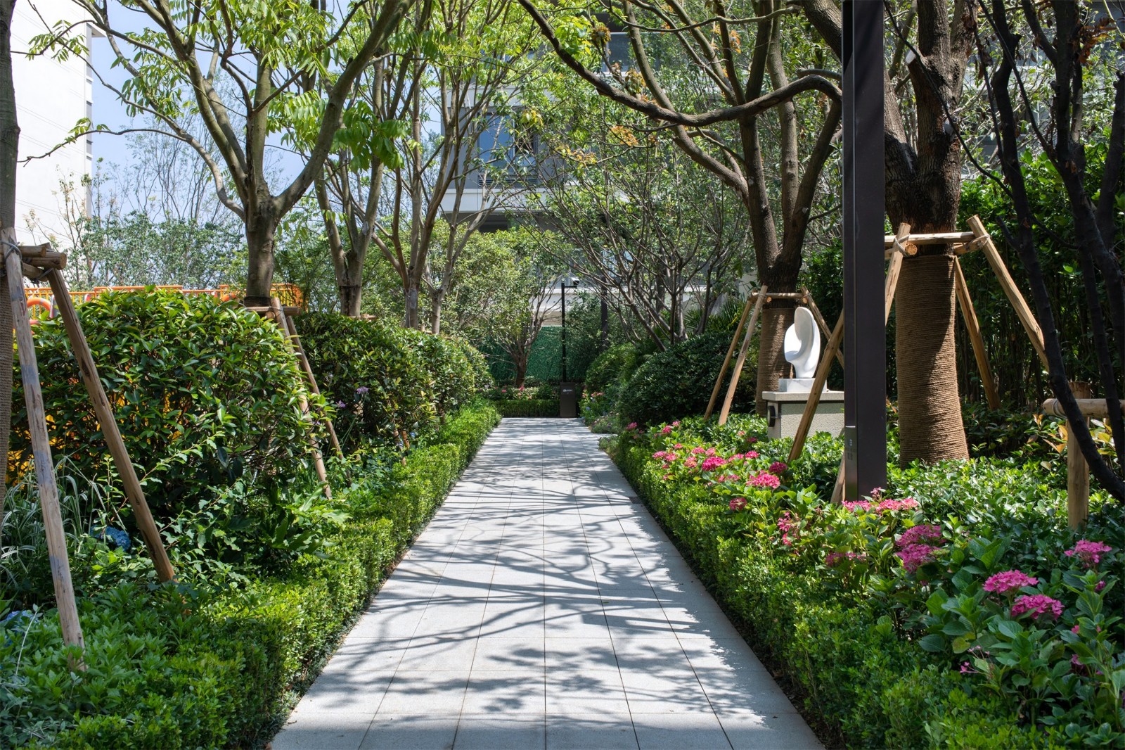 從熱鬧的軸線空間進(jìn)入安靜私密的花苑,氛圍的對(duì)比豐富了歸家體驗(yàn)。游園步道兩側(cè)的小品搭配綠植,增添趣味性,讓空間靈動(dòng)。