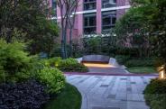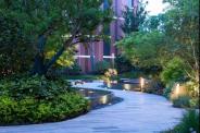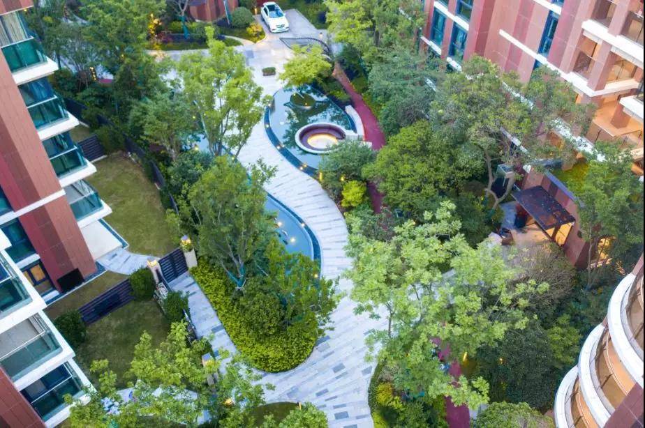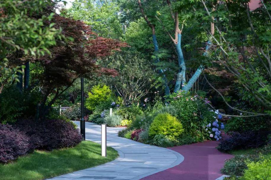植物的韻律散落在園區(qū)大小處,設(shè)計(jì)師采用多種植物、樹(shù)種錯(cuò)落搭配,隨著不同季節(jié),形成四季不同景致。除此之外,設(shè)計(jì)師最大化發(fā)揮了植物的環(huán)保作用——種植凈化能力強(qiáng)的植物吸收有害氣體;利用冠大而濃密的植物達(dá)到滯塵效果;隔離降噪,豐富立體植被形成小區(qū)多層次的空間隔離,進(jìn)一步達(dá)到靜音降噪的效果。