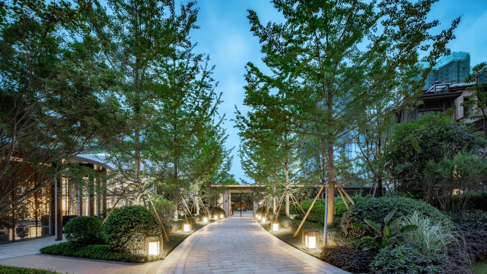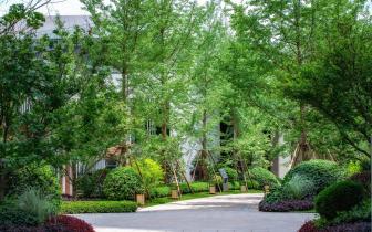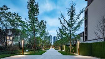 ?兩側(cè)喬木枝葉繁茂,下層灌木搭配得宜,燈具光溫暖明亮,具有延展性的空間在夜色中更顯輕靈。