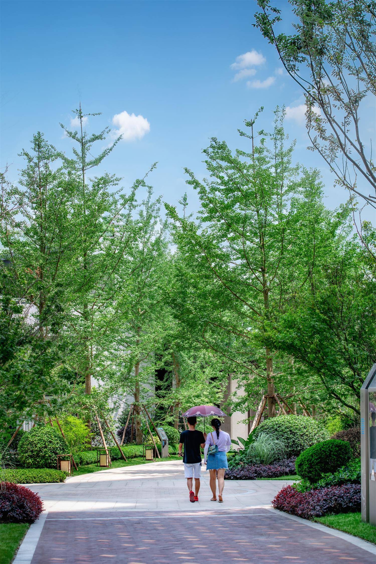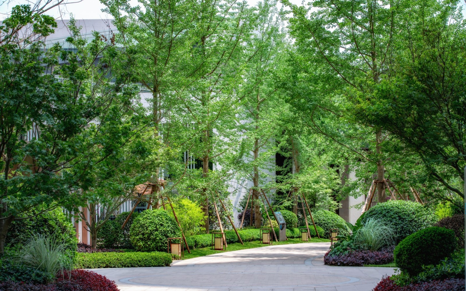 ?筆直的通徑,林立的樹木,多層灌木種植配合彩色花木,皆豐富單調(diào)的園路空間。
