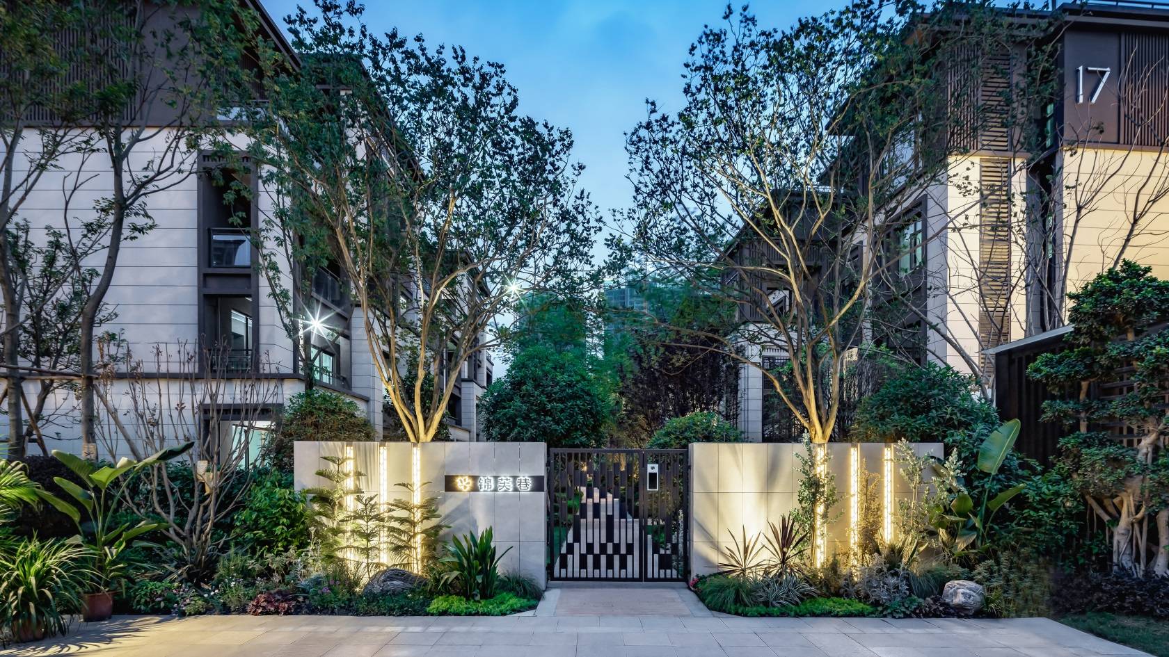 夜色中的歸家明燈,所屬地的林中護衛(wèi)。小院景墻對稱式圍合,種植層次豐富飽滿,兩側(cè)高大喬木守護著通往家的門戶,藝術(shù)照明體現(xiàn)細節(jié)品質(zhì),院門格柵樣式應(yīng)合整體藝術(shù)風(fēng)格。私密的林下小路,四季景觀多姿,下層灌木遮蔽人行來往,令生活舒適。