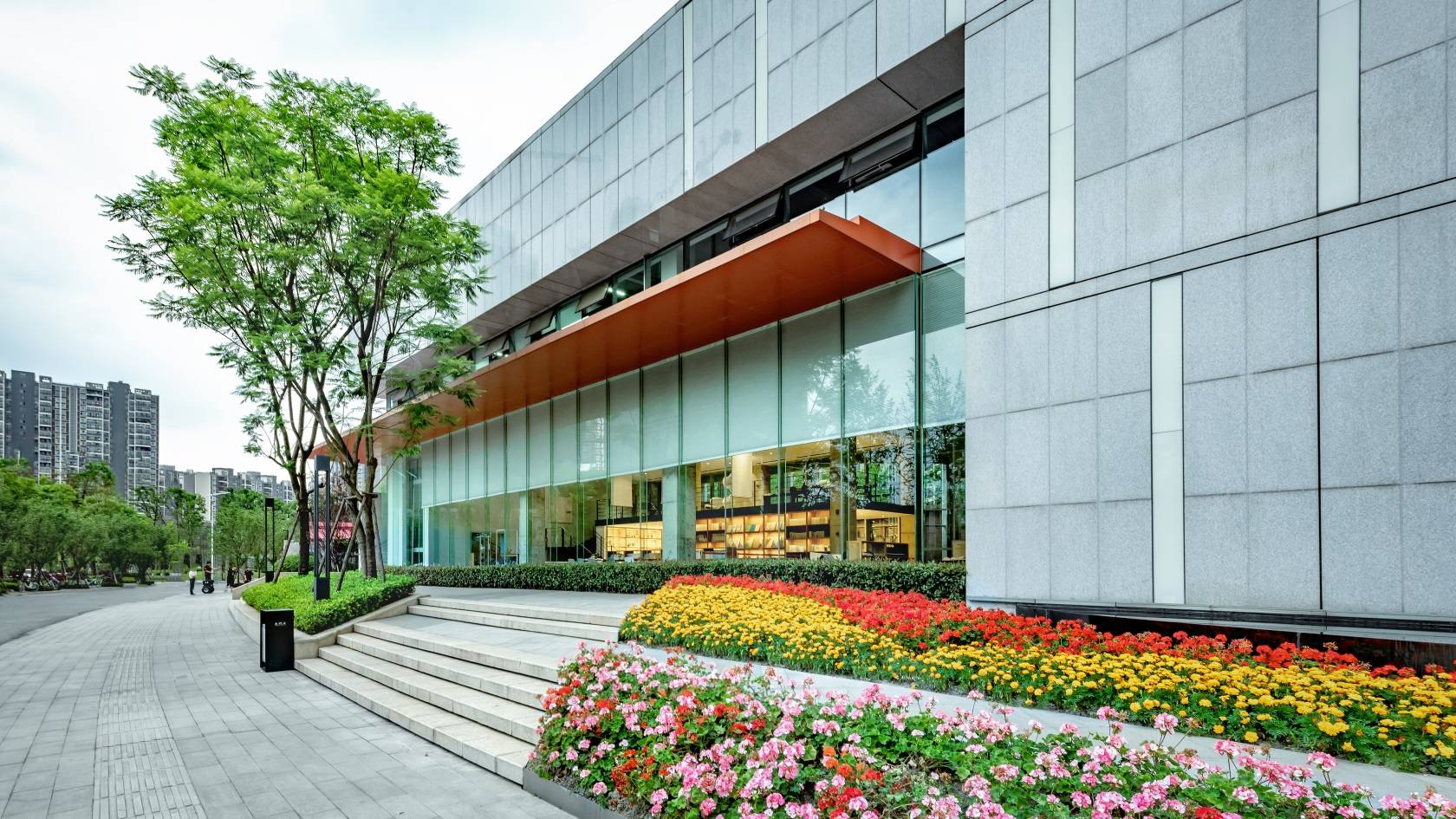 ?展示面空間開放,滿足空間集散功能,沿街種植花木,色彩絢麗,引人側(cè)目。