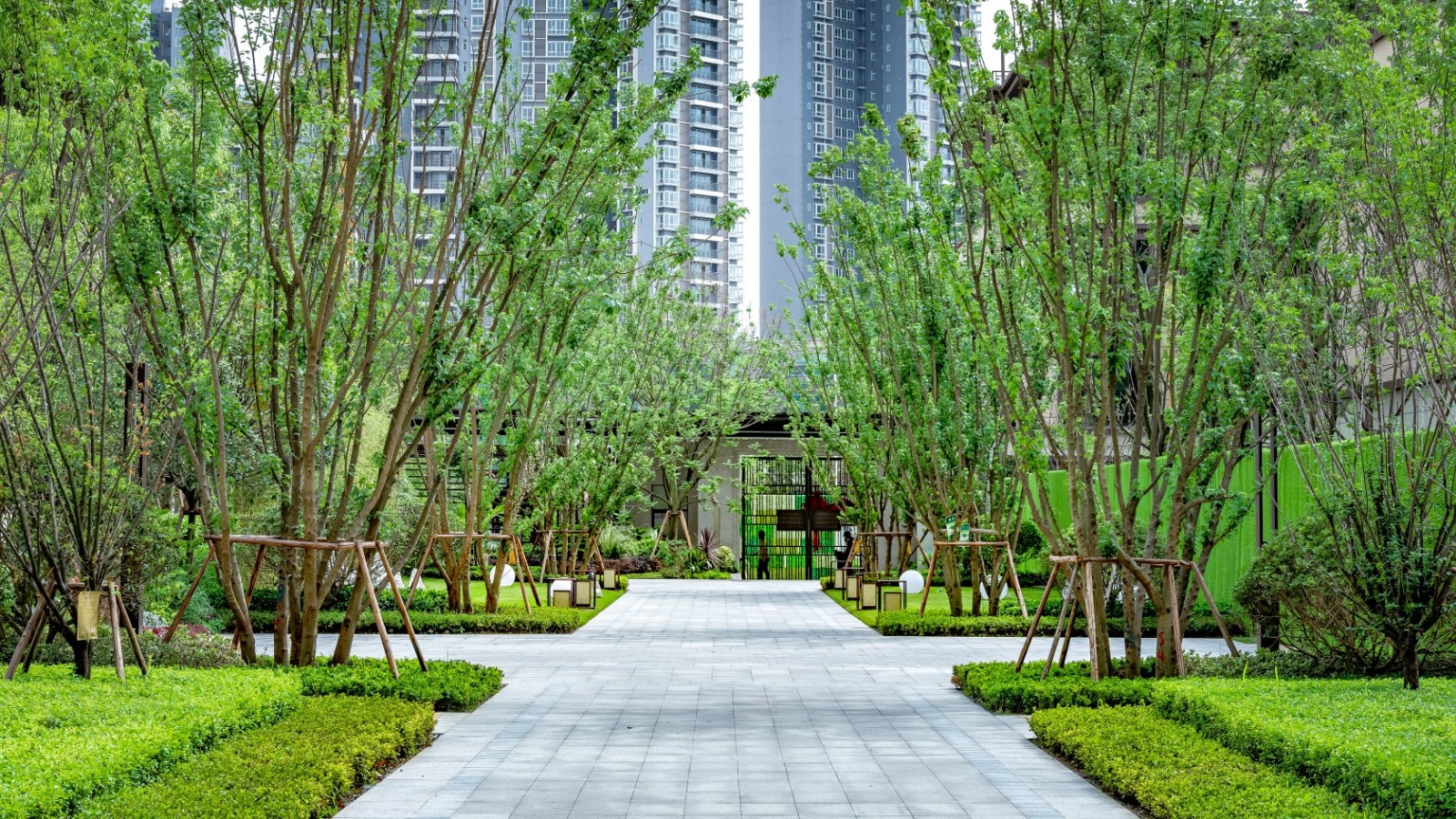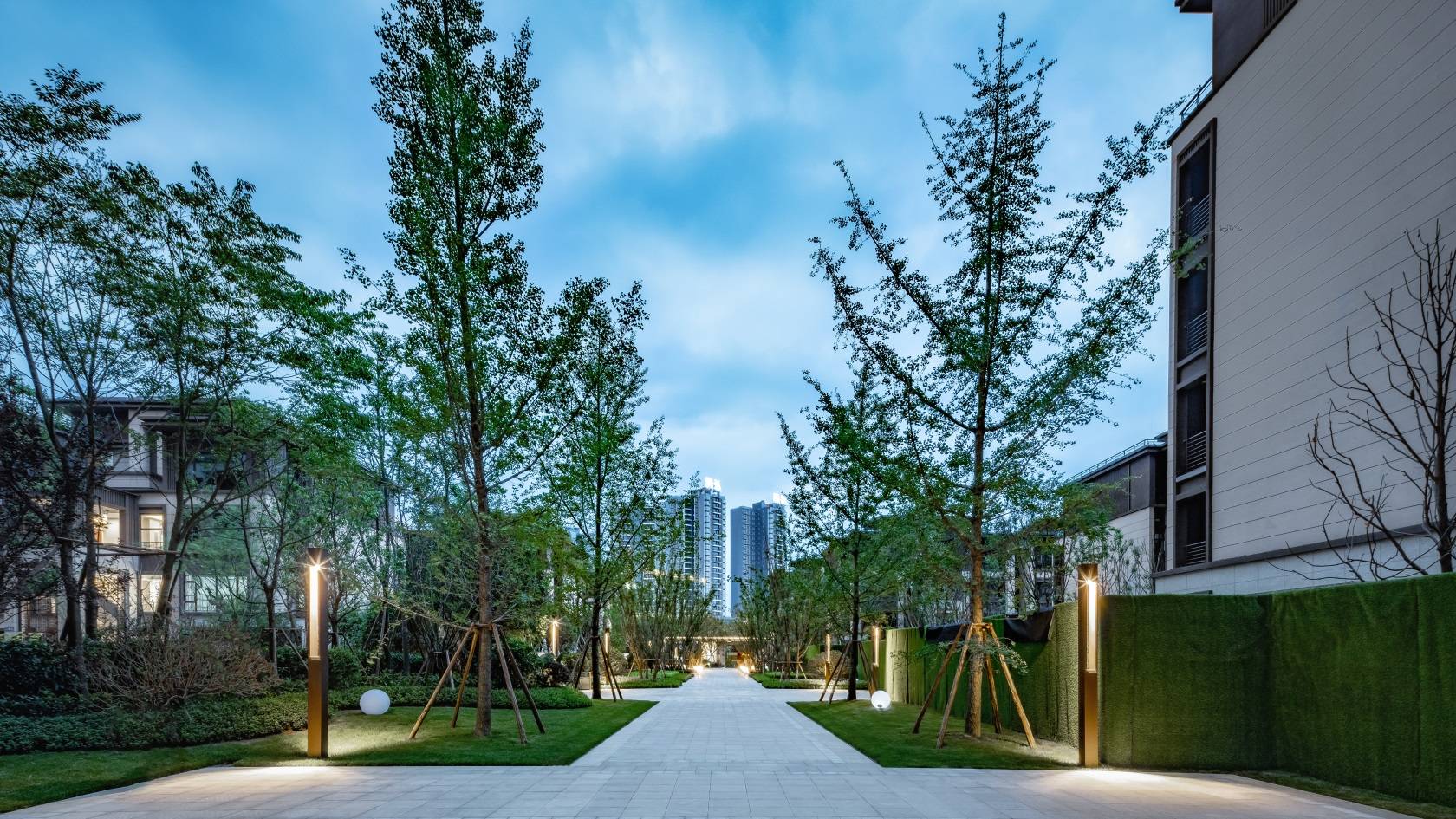 整體采用簡潔對稱式種植風(fēng)格,高大喬木配合兩側(cè)發(fā)光裝置構(gòu)建出情感流動的空間,光影投射處樹影婆娑,時空流轉(zhuǎn)。下層灌木及鋪裝效果等細節(jié)處理靈活舒適,彰顯品質(zhì)。
