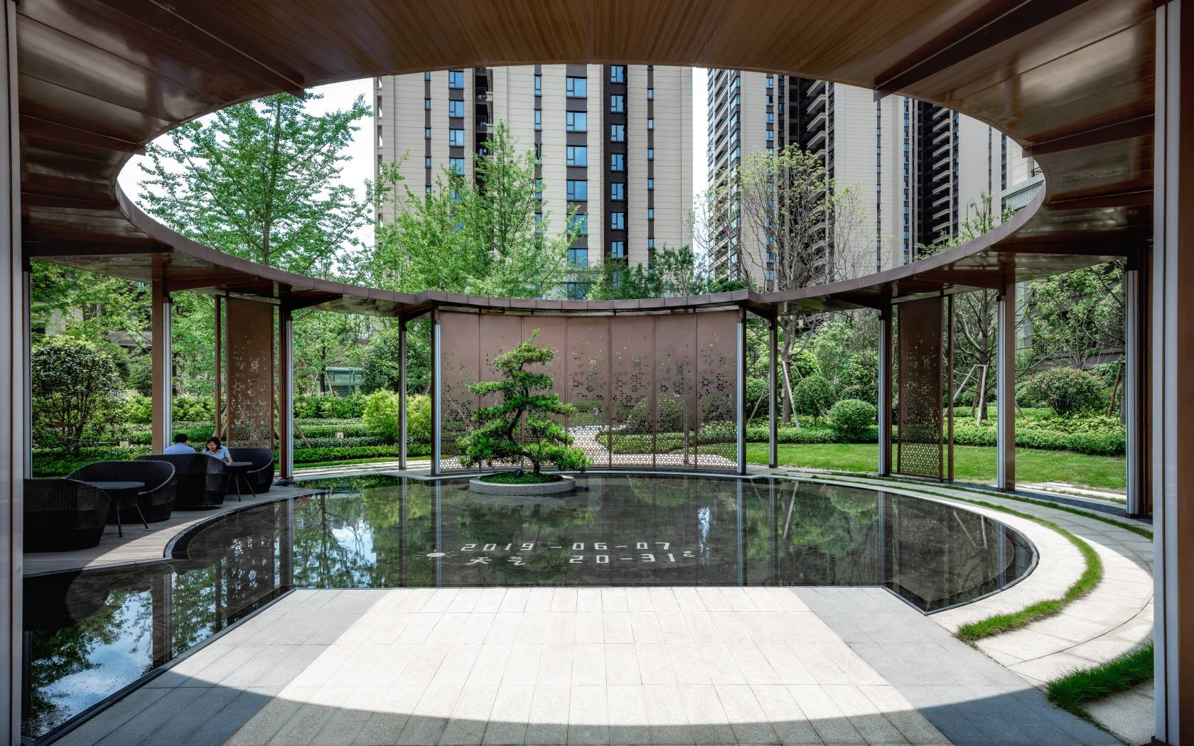 圓形通廊架構(gòu)出幾何景觀空間,整體連貫、細節(jié)完整。鏡水面終端的造型松則是點睛之筆,沿圓形輪廓散落布置座椅,打造休憩交談的花園庭院空間。