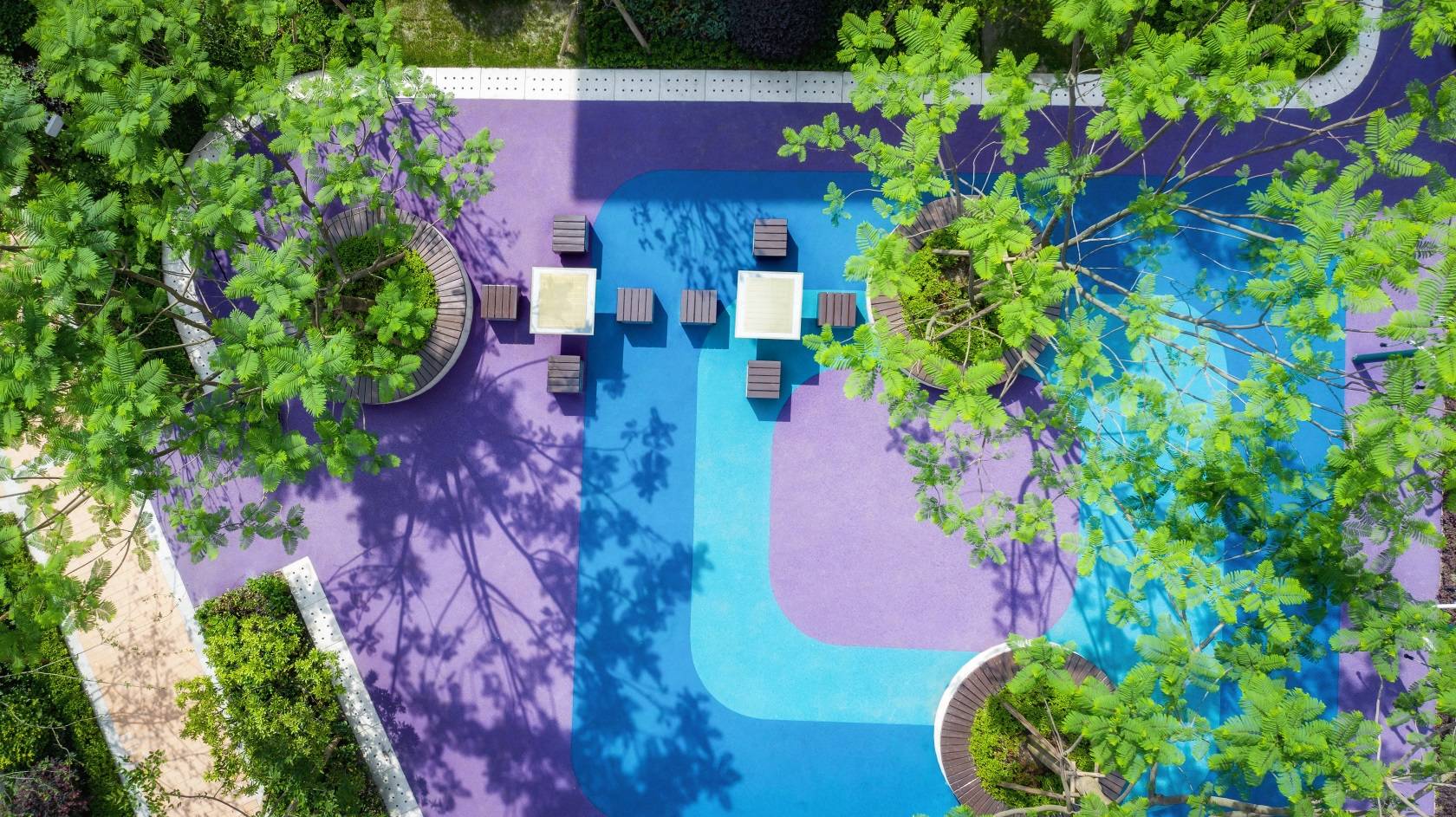 ?顏色明快的塑膠鋪裝、現(xiàn)代感十足的木質(zhì)座椅、高大喬木的景觀樹池及多功能健身器械是構(gòu)成居住區(qū)健康運動空間的主要景觀元素。