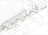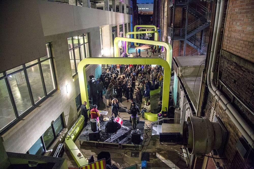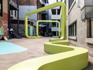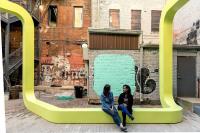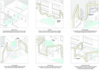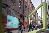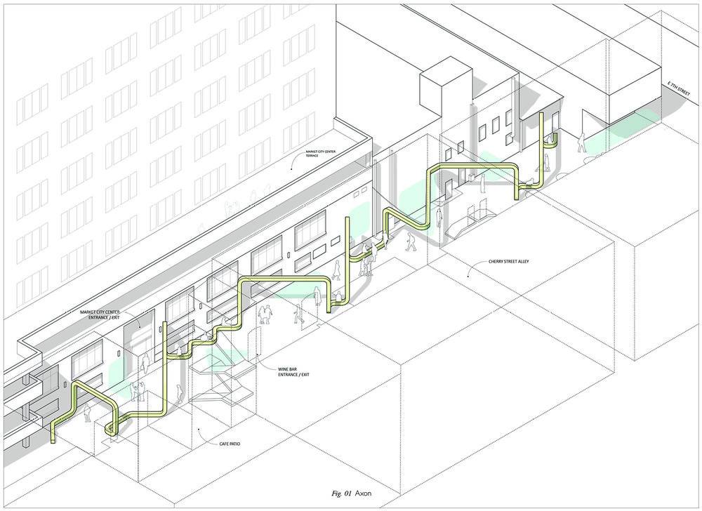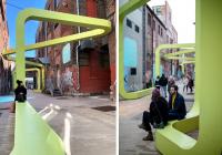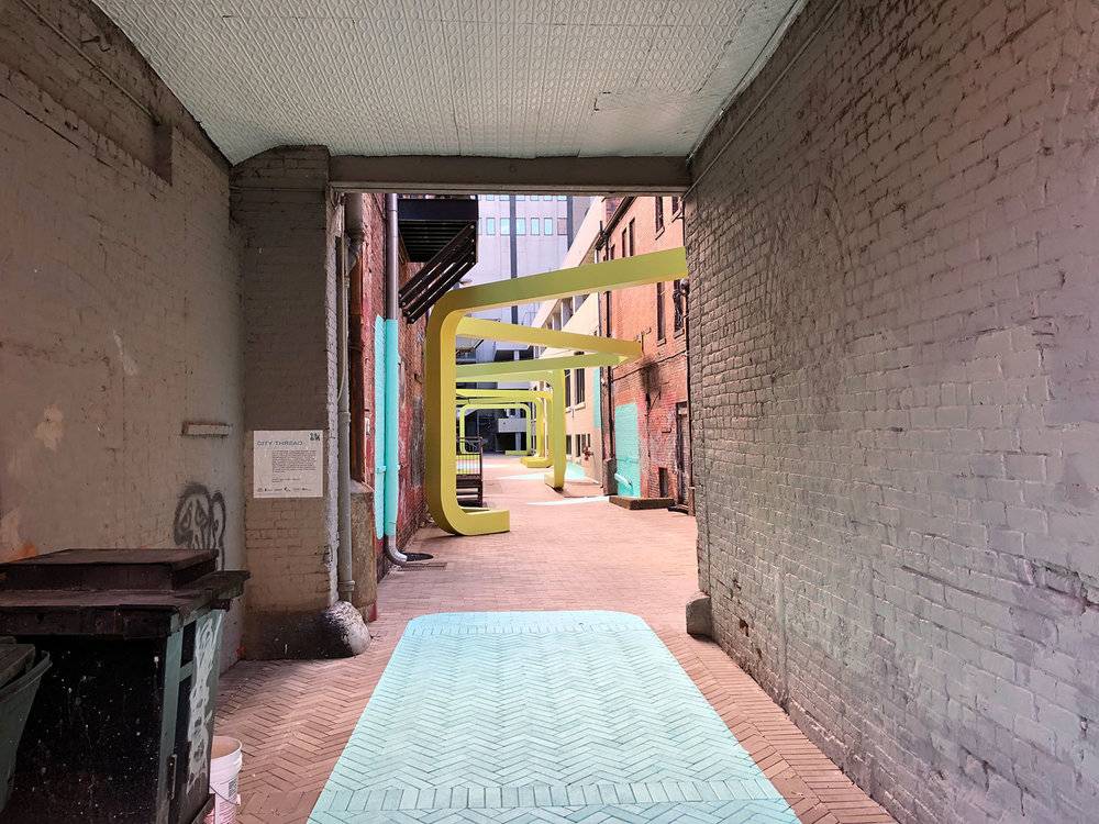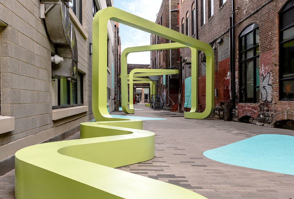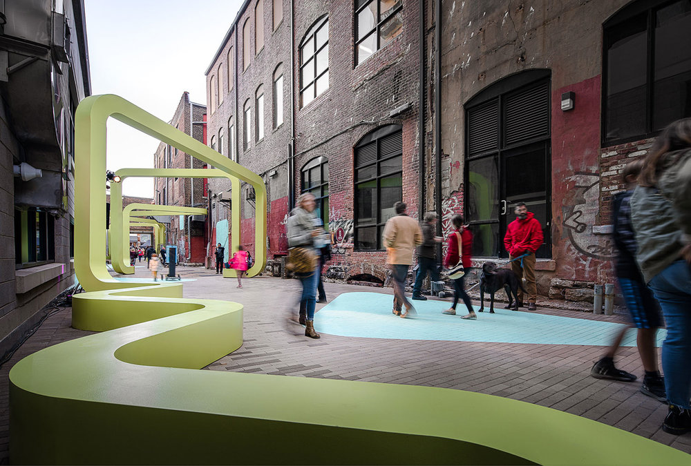一條500英尺(約152米)連續(xù)不斷的淺綠色鋼管和藍色油漆涂刷的幾何形在小巷空間內(nèi)以之字形形態(tài)將整個小巷空間劃分成一個多種多樣的小空間,為來訪者提供可進行多類活動的空間場所。在這個過程中,City Thread裝置也自然的將來訪者和當?shù)鼐用衤?lián)系在一起。