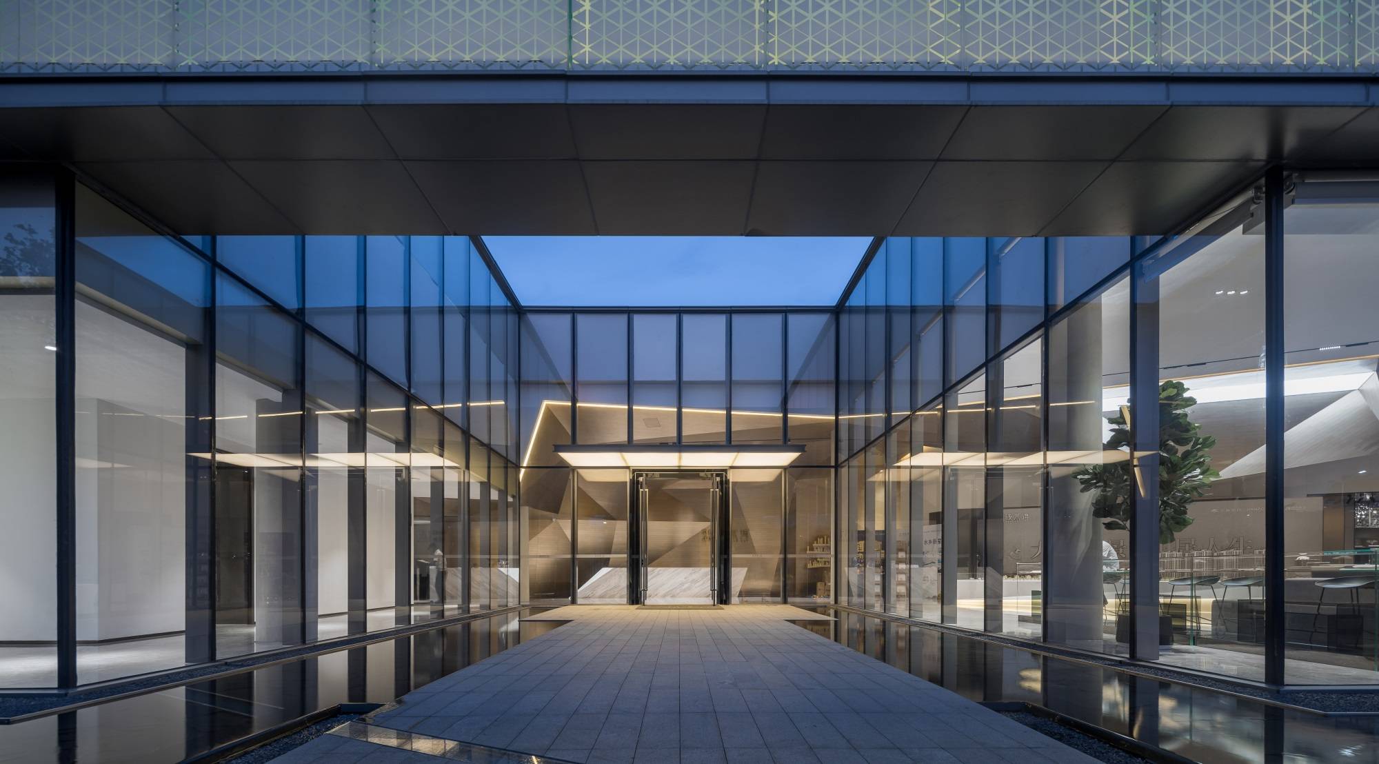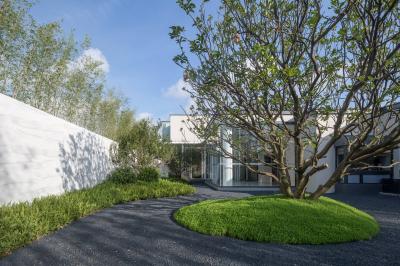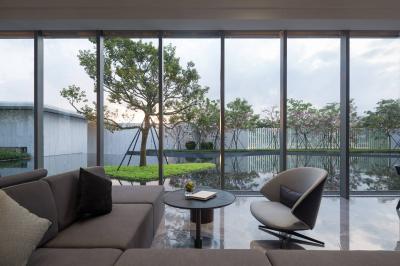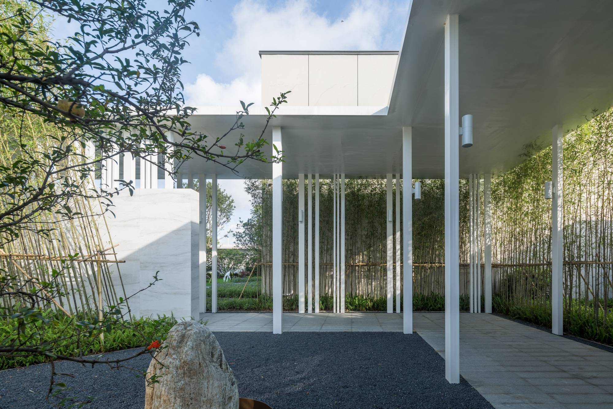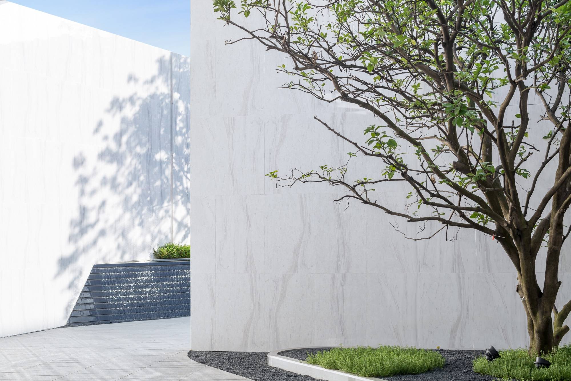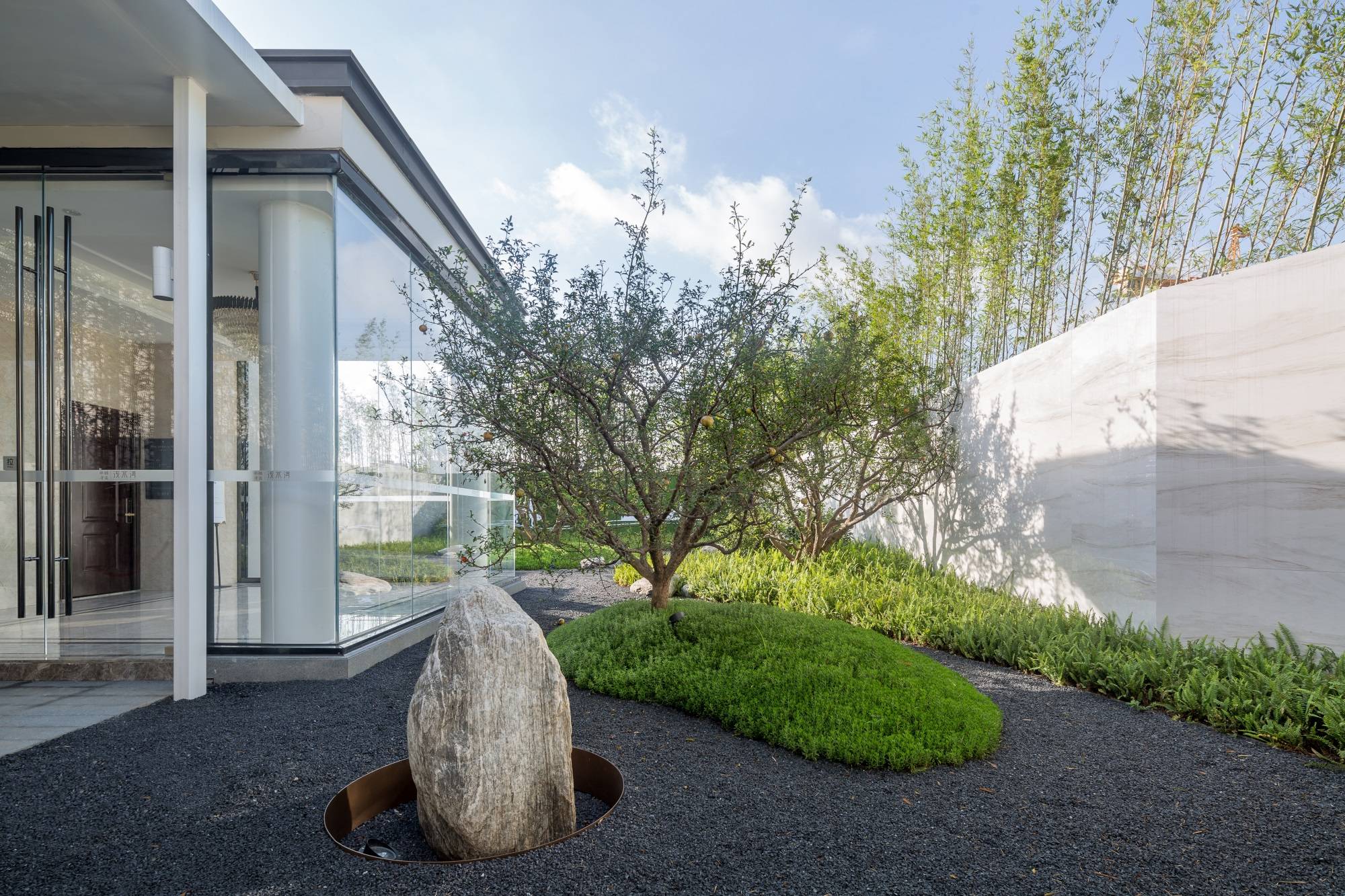 步入門樓,映入眼簾的叢生柚子,靜靜佇立其中,微風(fēng)吹過,光影搖曳。透窗的設(shè)計則借自然之美,繪現(xiàn)代東方之意。