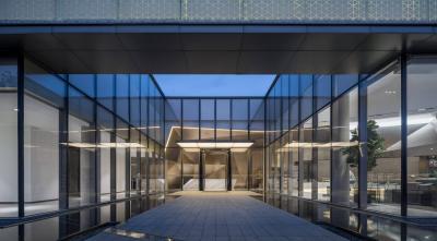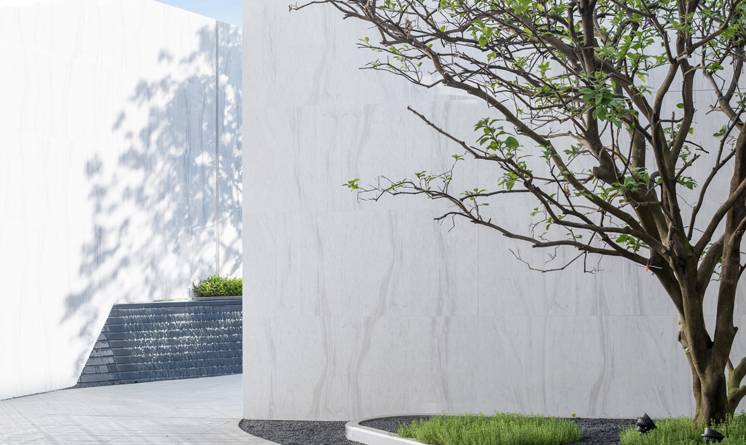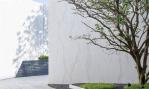 主入口景觀區(qū)一氣呵成的空間關(guān)系,在場地上劃分成多重景觀體驗,體驗一種仰望、行進(jìn)、觀賞的路線變化。好像律動的音樂,使人感受到節(jié)奏和秩序的美。大尺度的入口空間,以大氣明媚的氛圍強(qiáng)調(diào)入口。黑與白的空間色彩對話,成為視覺和精神的心之所向。