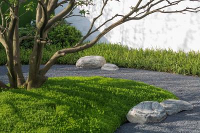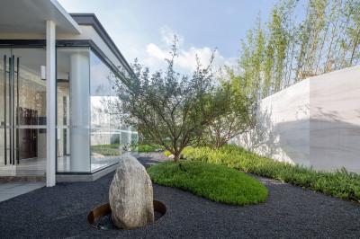 走過連廊,頓時讓人安靜下來,猶如靜靜地觀賞一幅水墨畫。后場極盡自然,依舊風(fēng)雅。曲線形式把空間演繹得淋漓盡致,進(jìn)一步渲染東方的地域特色,精美而簡潔,卻也不失現(xiàn)代溫度。一隅天地,偶爾清閑,就足以讓繁忙的日常變得生動,全部感官得以放松,置于營造的自然空間里。