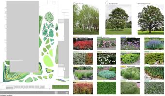 不同品種的橡樹(Quercus cerrioides, Quercus cerris, Quercus rubra)在建筑物之前形成了一片小樹林景觀,而沿街方向的一排樺樹(Betula pendula)構(gòu)成了從室內(nèi)到室外的過渡景觀。