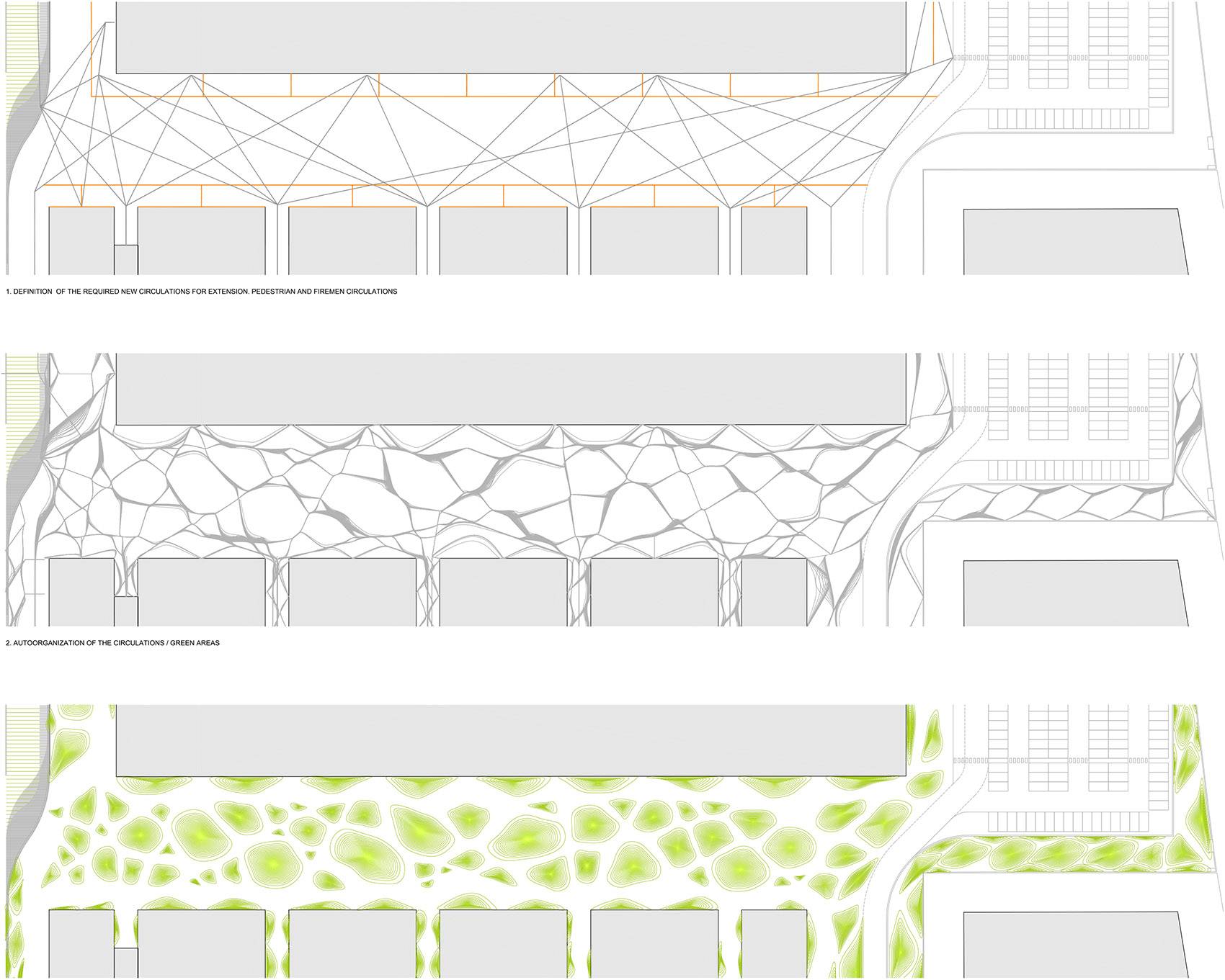 設(shè)計首要確定了人行通道和消防通道的位置。在此之后,設(shè)計團隊將必要的信息錄入到圖形算法編輯器中,以便根據(jù)兩棟建筑物的間距自行組織和優(yōu)化員工所需的交通空間,然后在其中創(chuàng)建出不同大小的綠地。